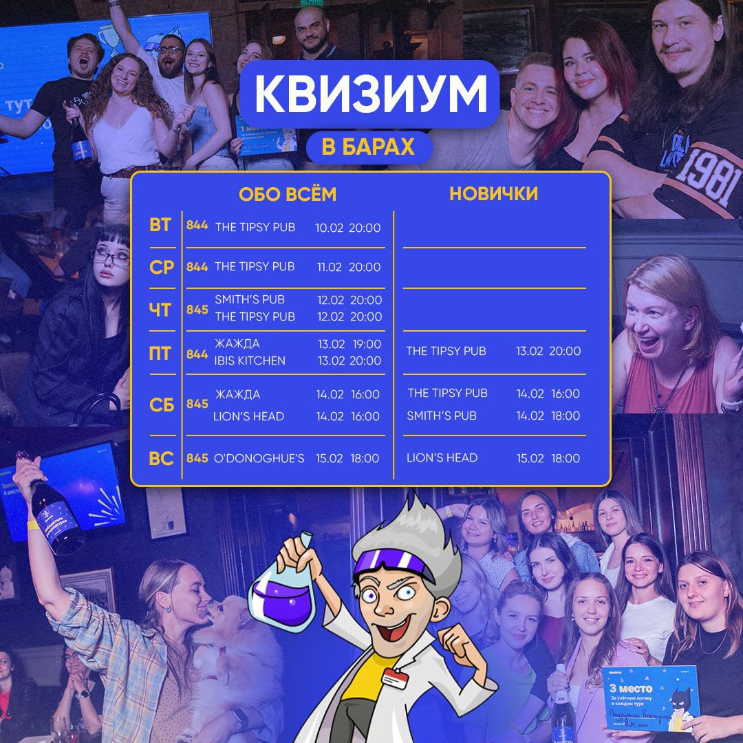 Классические квизы в барах столицы подарят прекрасные вечера со вторника по воскресенье. Смена обстановки после работы или классный досуг на выходные — поводов много, скорее собирайте завсегдатаев и Новичков.