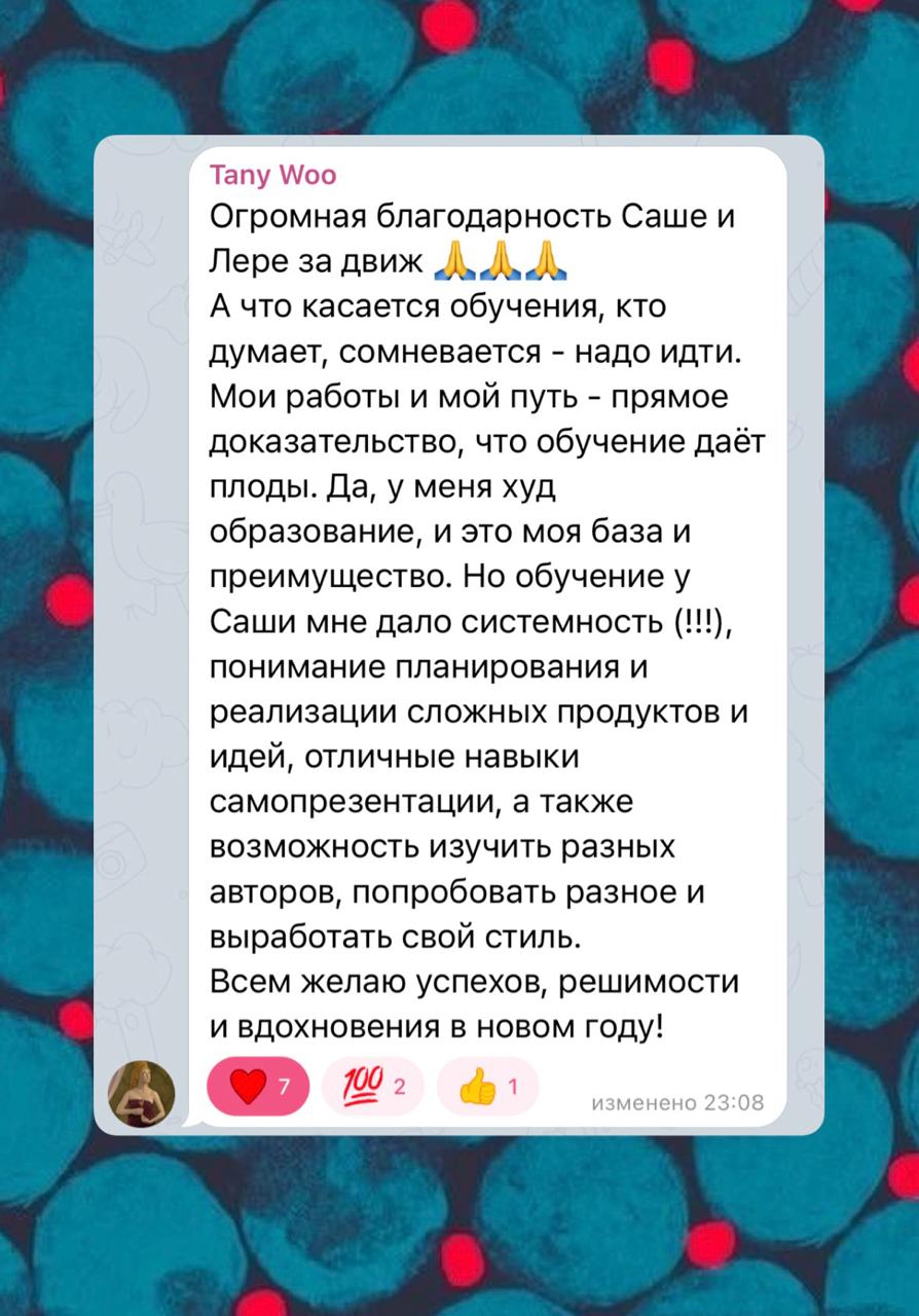 - Потрясающее сообщество единомышленников, поддержка от учеников и мое участие каждый день. Это бесценно, и да, я отвечаю на все вопросы.