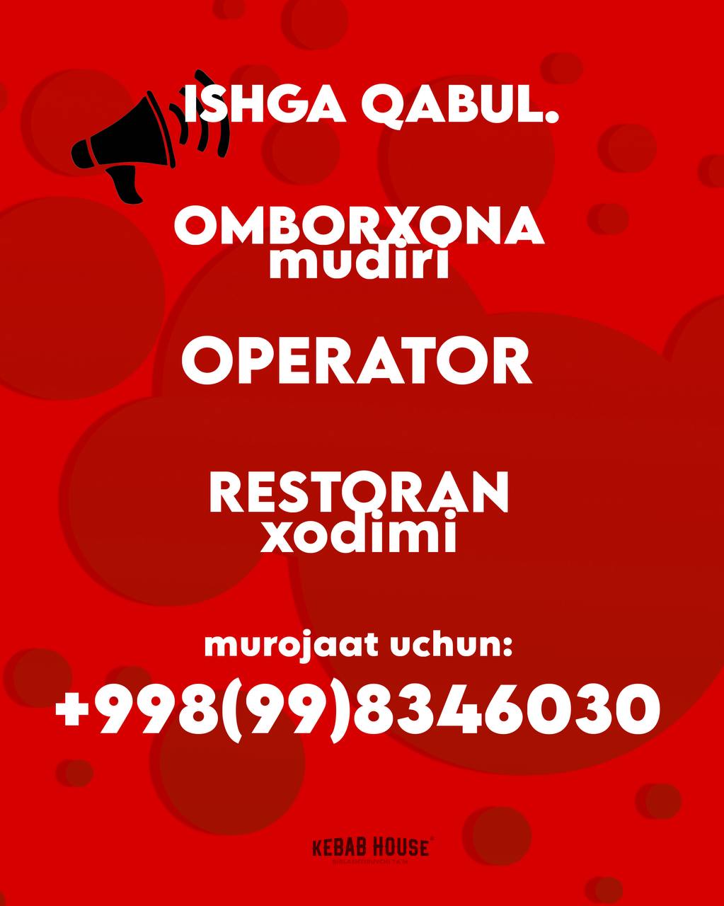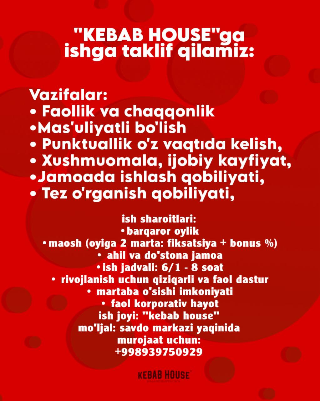 “KEBAB HOUSE” ga ishga taklif qilamiz:RESTORAN XODIMLARI.