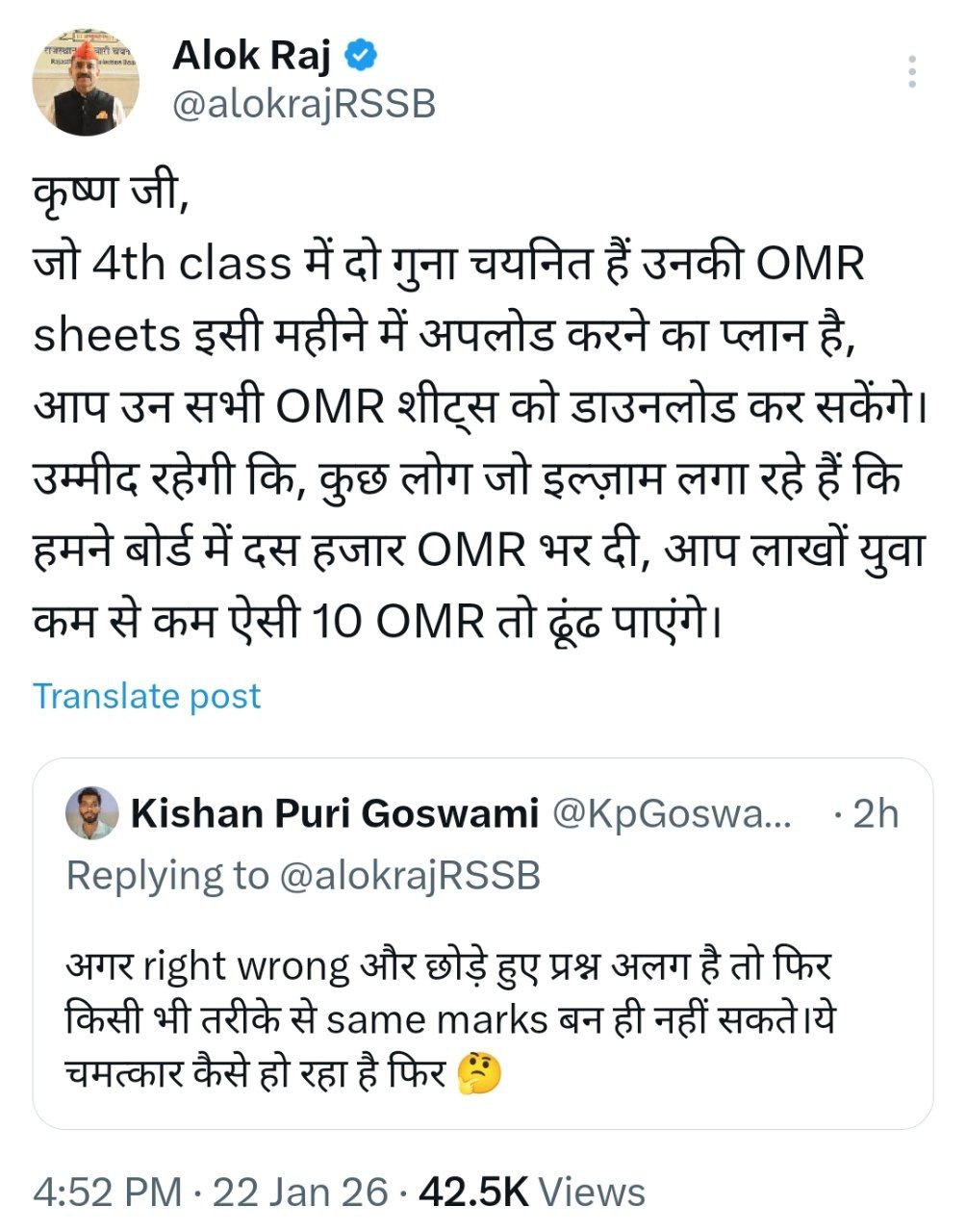 जो 4th class में दो गुना चयनित हैं उनकी OMR sheets इसी महीने में अपलोड करने का प्लान है, आप उन सभी OMR शीट्स को डाउनलोड कर सकेंगे। उम्मीद रहेगी कि, कुछ लोग जो इल्ज़ाम लगा रहे हैं कि हमने बोर्ड में दस हजार OMR भर दी, आप लाखों युवा कम से कम ऐसी 10 OMR तो ढूंढ पाएंगे।