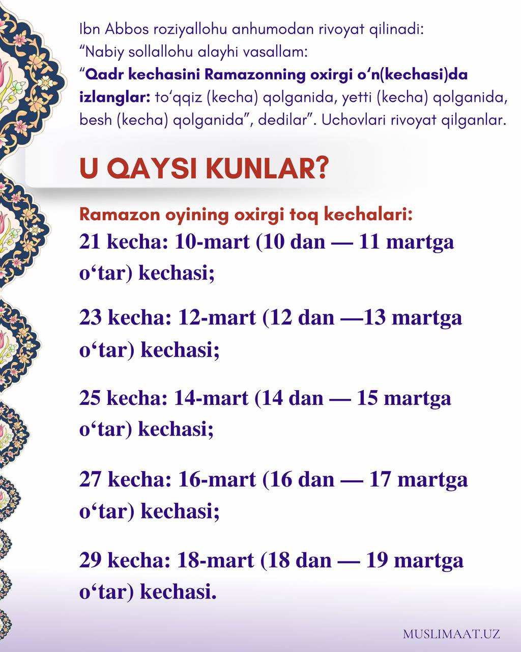 🕌МИНГ ОЙДАН АФЗАЛ КЕЧАНИ ҚАЙСИ КУНЛАРДА ИЗЛАЙМИЗ?