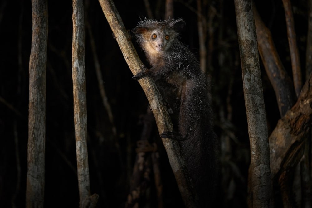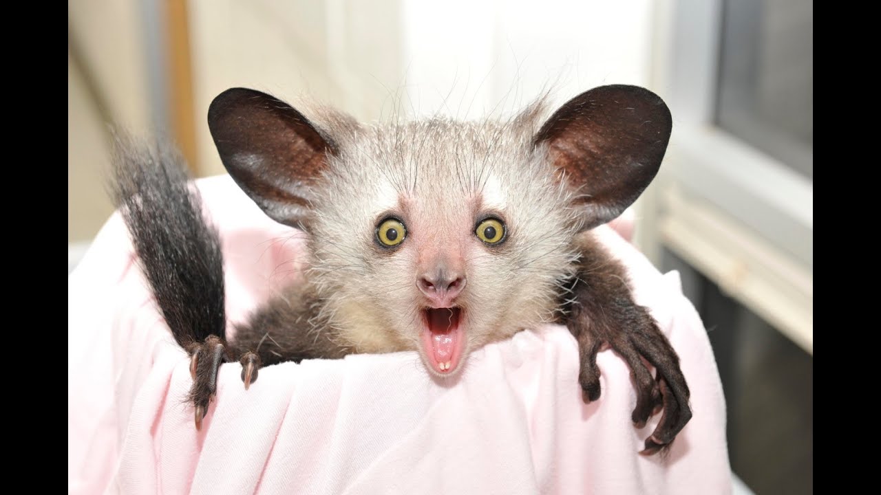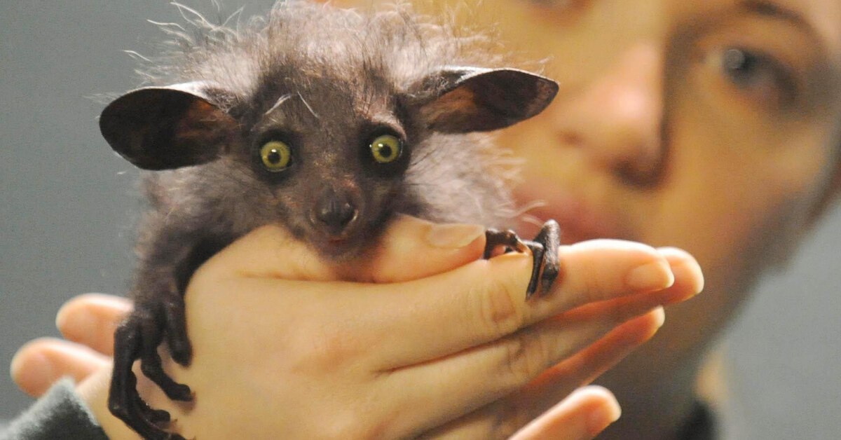 Это, пожалуй, самый визуально отталкивающий и странный примат в мире! У ай-ай огромные, вечно удивленные янтарные глаза, которые светятся в темноте, и несоразмерные кожистые уши-локаторы, которые постоянно двигаются. Добавьте к этому растрепанный жесткий мех и постоянно открытый рот с растущими всю жизнь резцами (как у грызунов), и вы получите персонажа, который выглядит как плод галлюцинации нейросети.