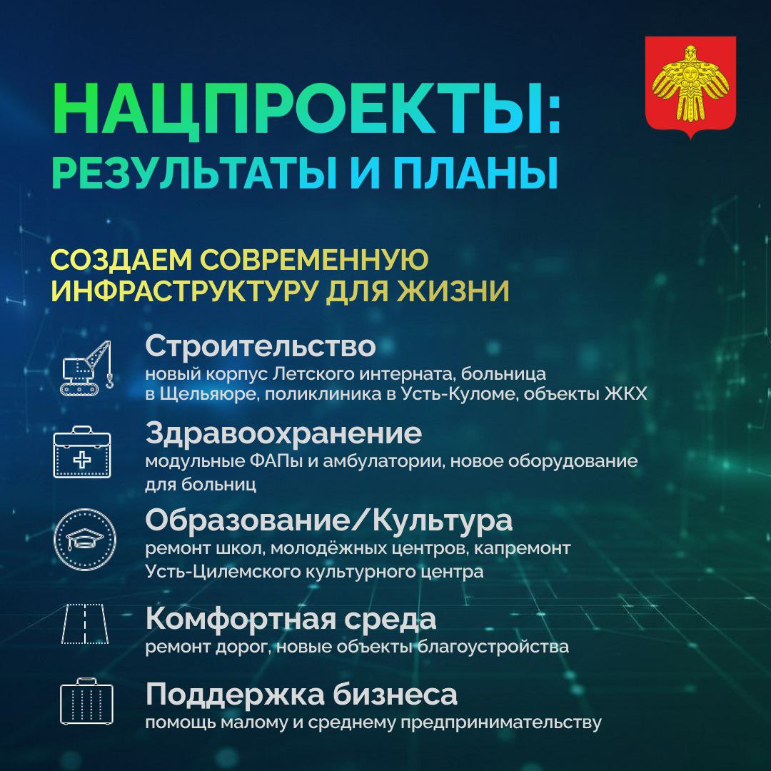 🏫 Образование и культура: ремонт школ, молодёжных центров, капитальный ремонт Усть-Цилемского культурного центра.