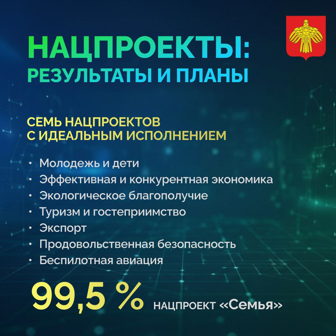 Также высокий уровень исполнения по нацпроекту «Семья» - он составил 99,5%.