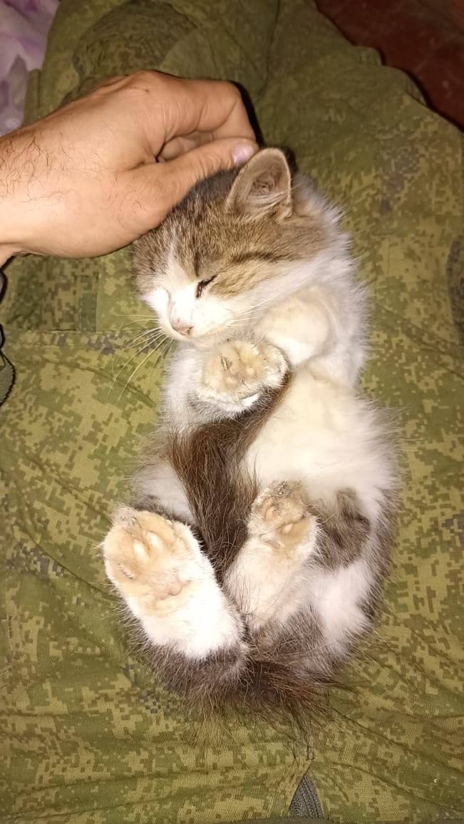 Это было на фронте, в зоне СВО. Мы тогда срочно передислоцировались на новое направление. Вокруг — пыль, взрывы, усталость, постоянное напряжение. Когда только прибыли и начали осматриваться, из ниоткуда ко мне вышел маленький котенок. Грязный, взъерошенный, испуганный. Он шел прямо ко мне. Осторожно. Маленькими шагами. Как будто знал — именно сюда нужно идти. Я взял его на руки. Он помещался в ладони. Посмотрел мне в глаза, тихо мяукнул и вдруг замурлыкал. Тоненько, как маленький моторчик. В тот момент что-то внутри щелкнуло. Мы уже были вместе.
