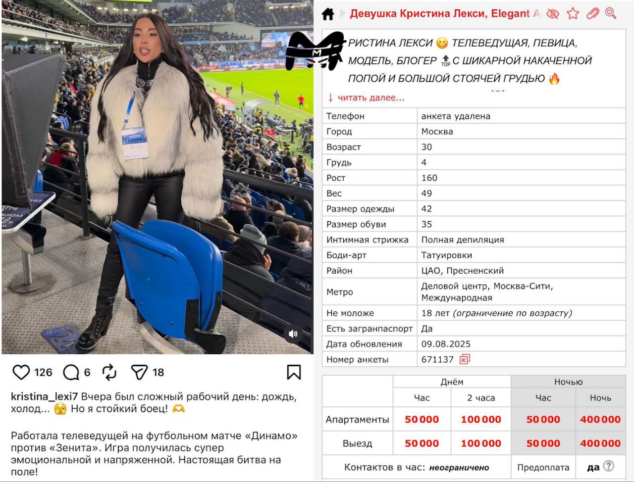 Бывшая девушка Паши Техника была содержанкой у половины основного состава "Зенита". По данным Mash на спорте, Кристина Лекси обслуживала Сердара Азмуна, Вендела и примерного семьянина Кристиана Нобоа. По очереди.