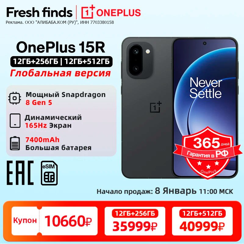 🆕🆕📱 OnePlus 15R - сегодня стартует продажа в 11:00 МСК (165 Гц, Snapdragon 8 Gen 5 (AnTuTu ~3М), 🔋 7 400 мАч )