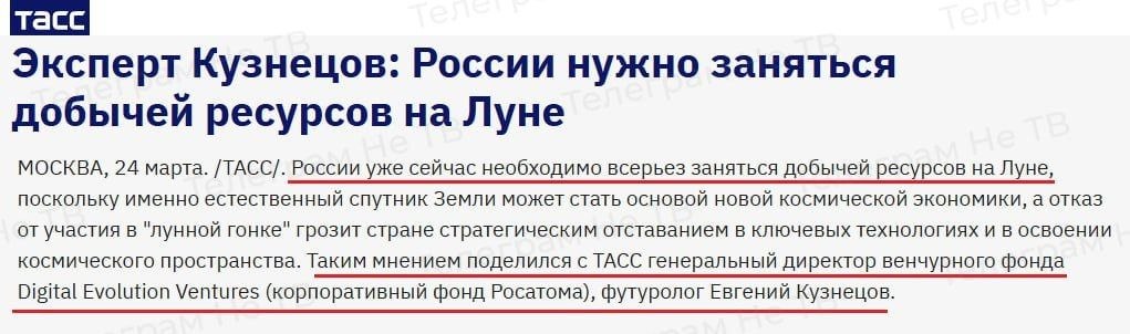 ТАСС, Эксперт Кузнецов: России нужно заняться добычей ресурсов на Луне