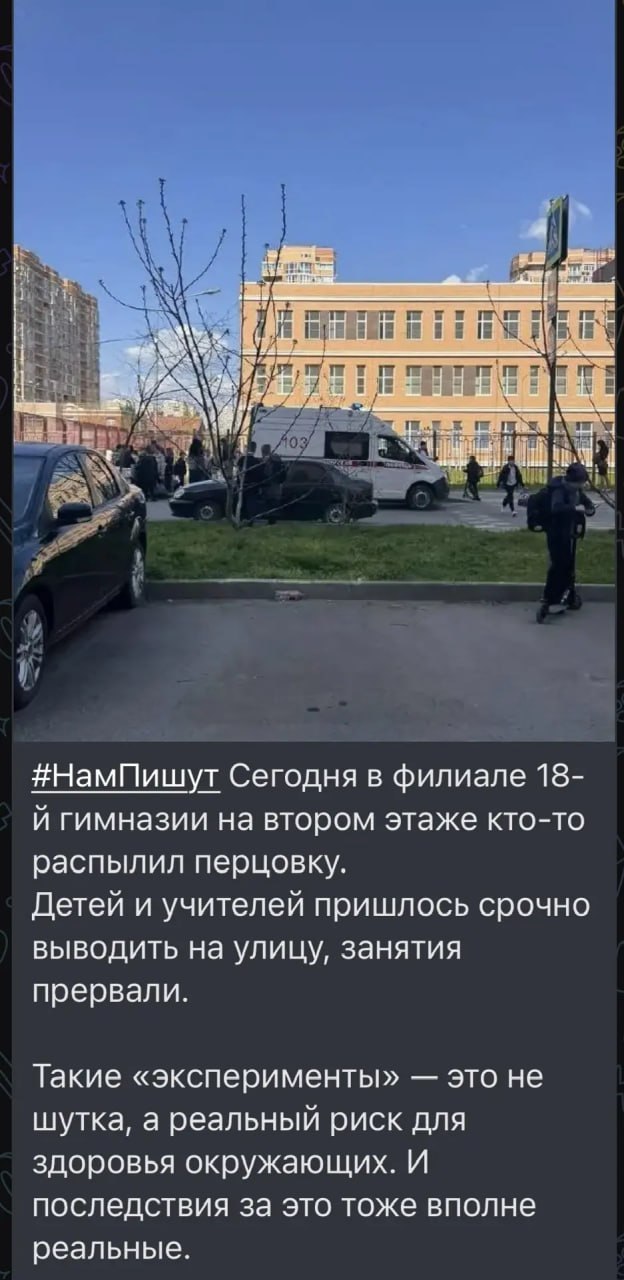 16 апреля в филиале гимназии №18 (проезд К. Образцова, 12) ученик 9 класса распылил перцовый баллончик. Двое детей были доставлены в больницу. Полиция опрашивает школьника и его родителей. Школа провела санитарную обработку и проветривание помещений.