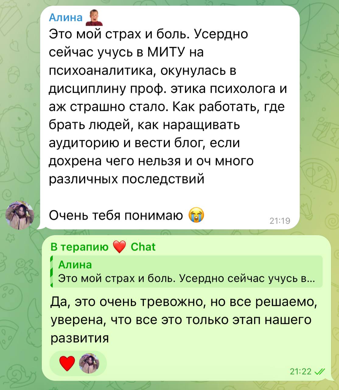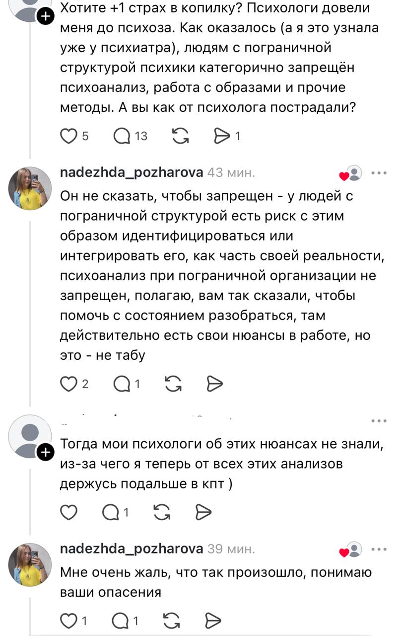 Многие специалисты, кто устал от карательной «этики» и боится дышать на сессиях, чувствуют то же самое, мне важно отстаивать право на живого, чувствующего, имеющего свою историю терапевта не как срыв границ, а как сознательный выбор работать в поле настоящих, сложных, иногда страшных, но реальных отношений