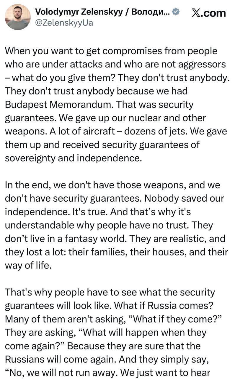 А наши американские друзья готовят гарантии безопасности. Но они сказали – сначала обмен территориями, или что-то подобное, а потом гарантии безопасности. Я думаю, сначала гарантии безопасности. Во-вторых, мы не отдадим свои территории, потому что мы готовы к компромиссу. К какому компромиссу мы готовы? Не к тому компромиссу, который даст России возможность быстро восстановиться, вернуться и оккупировать нас. Это важный момент.