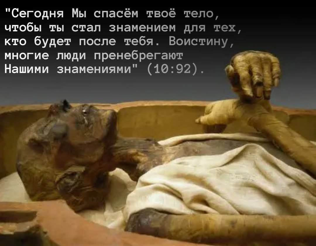 «Сегодня сохраним твоё тело, чтобы ты был для последующих народов знамением, но многие из людей не замечают наши знамения» ("Юнус", 92).