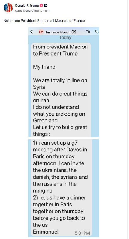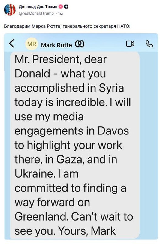 "Господин Президент, дорогой Дональд — то, что вы сегодня сделали в Сирии, невероятно. Я использую свои медийные выступления в Давосе, чтобы подчеркнуть вашу работу там, в Газе и на Украине. Я привержен поиску пути вперёд по Гренландии. С нетерпением жду встречи с вами.