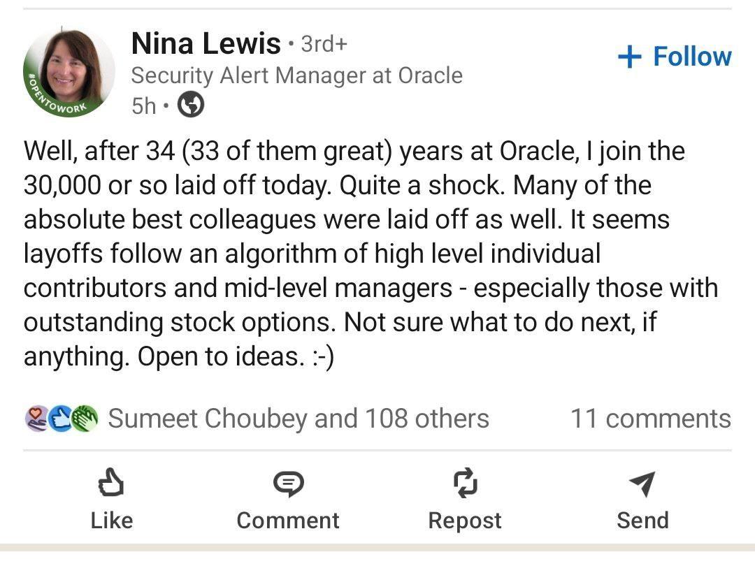 Сотрудницу Oracle уволили после 33 лет работы в компании. Нина Ньюис написала об этом пост и обновила своё резюме в Linkedin. Она пришла Oracle в 1992 году техническим специалистом, а закончила менеджером по вопросам безопасности. Девушка уверена, что увольнения доверили алгоритмам, потому что под сокращения попали даже работники, которым принадлежат акции компании.