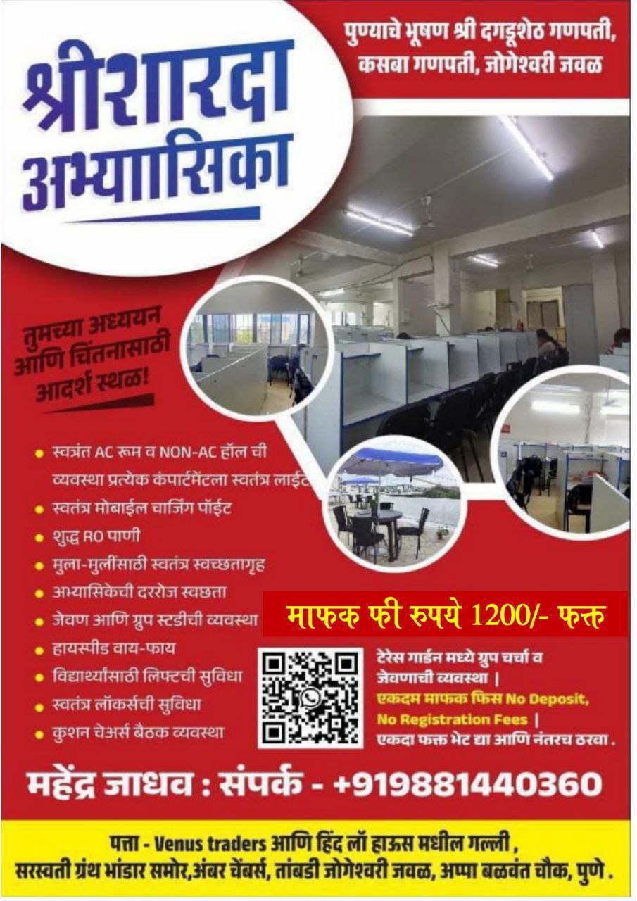 💣 शनिवार पेठ, नारायण पेठ, सदाशिव पेठ मधील ,बुधवार पेठ, अप्पा बळवंत चौक मुलांनो एकडे लक्ष द्या - आपल्या सेवेसाठी आता श्री शारदा अभ्यासिका हजर