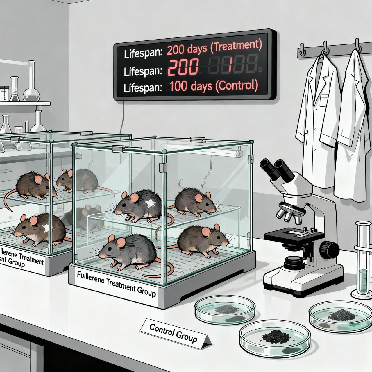 Половина животных, получавших фуллерен, жили до 60 месяцев (самая старая крыса дожила до 5,5 лет). При этом в контрольной группе (с обычной диетой) продолжительность жизни 50% животных составляла 30 месяцев, а самые старые дожили лишь до 37 месяцев. Животные, получавшие оливковое масло без фуллерена, жили немного больше — 50% из них доживали до 40 месяцев, а самая старая крыса дожила до 58 месяцев.