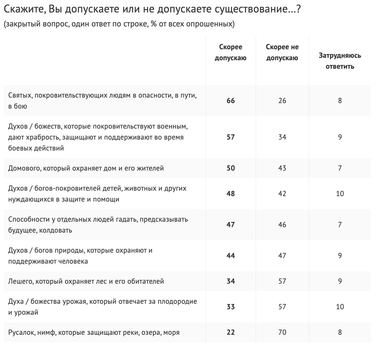 81% жителей России допускают существование сверхъестественных сил. Наибольшее доверие вызывают «святые, покровительствующие людям в опасности, в пути, в бою» — их существование не вызывает сомнений у 66% опрошенных.