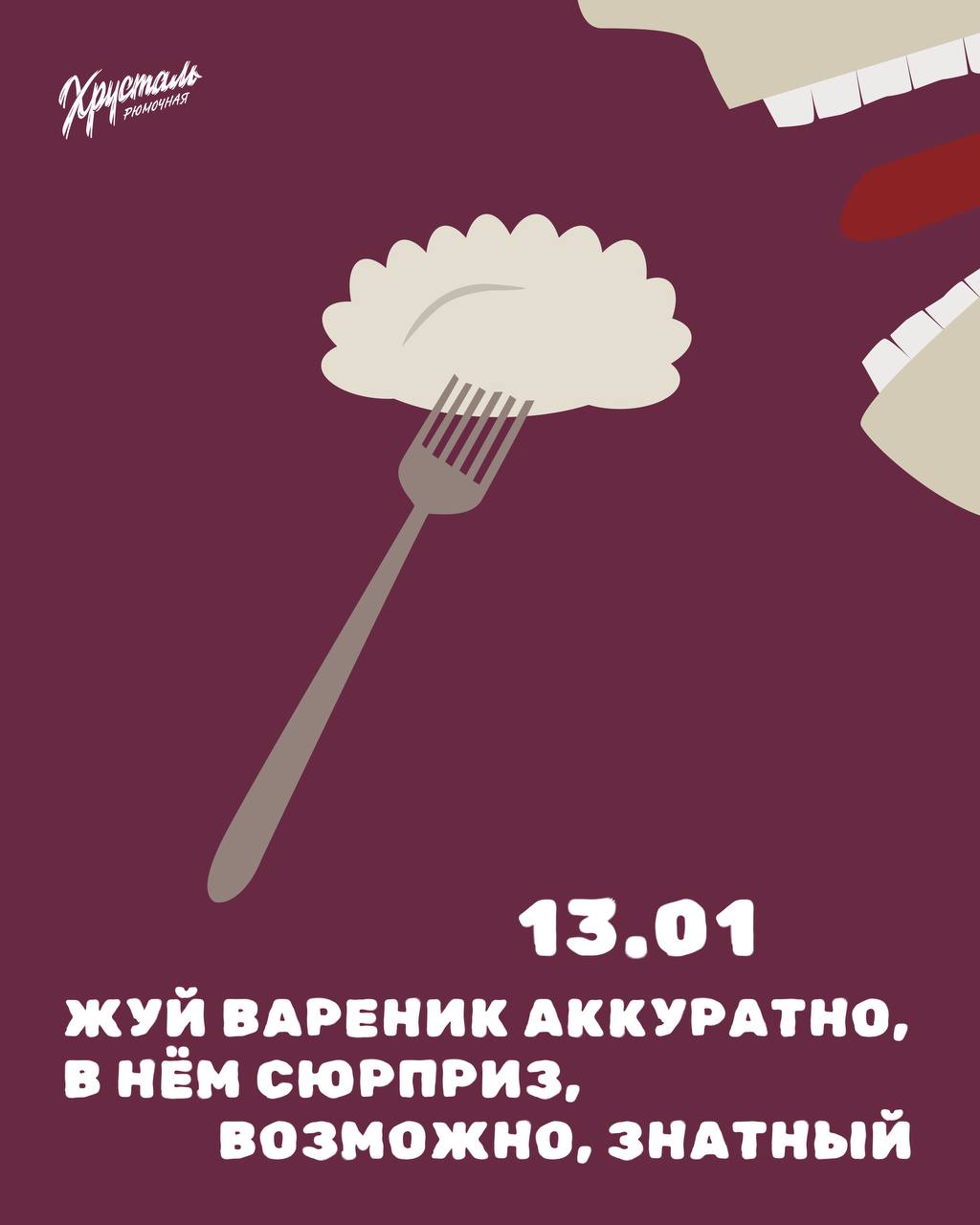 В Хрустале 13 января будем лепить и варить вареники. Такие, как надо. С сюрпризами внутри. Кому-то попадётся монетка, и все сразу решат, что это к деньгам. Кому-то перчик, и начнутся разговоры про приключения и «держись, новый год». А кому-то вообще все равно на сюрпризы, просто вдохнёт этот пар, запьёт холодненькой стопочкой и скажет, что важнее всего, чтобы вареники были вкусные.