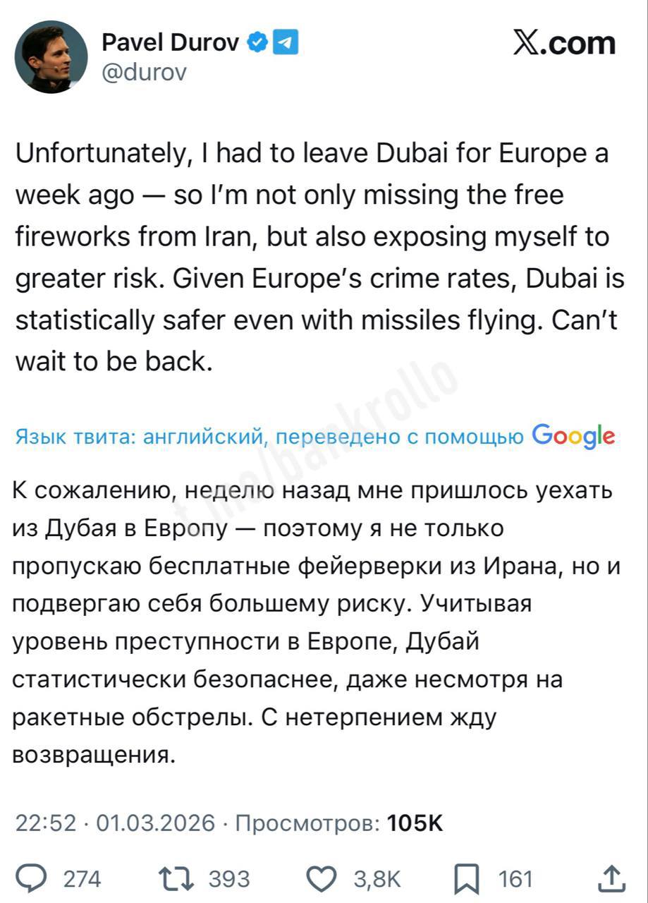 «К сожалению, неделю назад мне пришлось уехать из Дубая в Европу, поэтому я не только пропускаю бесплатные фейерверки из Ирана, но и подвергаю себя большему риску. Учитывая уровень преступности в Европе, Дубай статистически безопаснее, даже несмотря на ракетные обстрелы. С нетерпением жду возвращения».