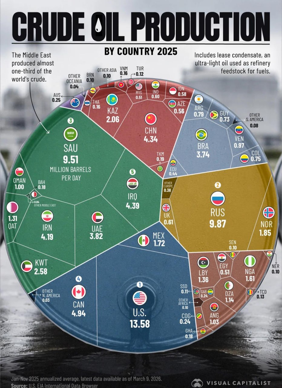 🇷🇺В 2025 году всего пять стран производили половину мировой нефти, при этом на долю США, России и Саудовской Аравии приходилось почти 40% мирового предложения.