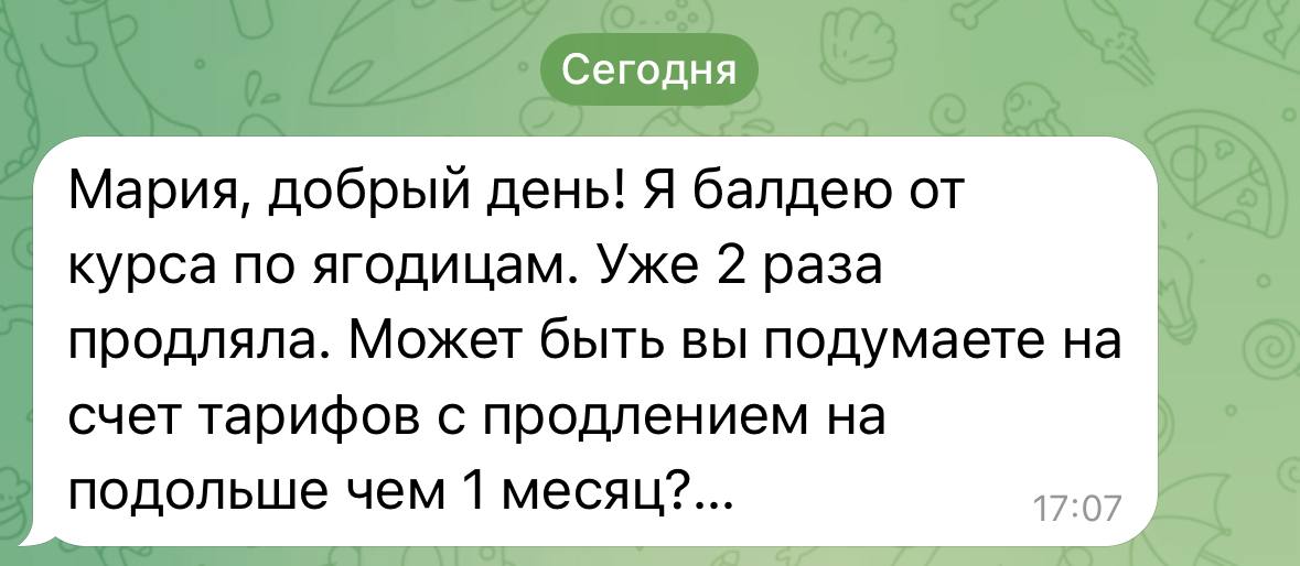 Вот пример: сейчас со мной на тарифе с моим сопровождением занимается девушка, у которой двое малышей, которые не слезают у неё с шеи и она в декрете. Есть еще взрослый ребенок. Вначале, когда мы с ней переписывались, она не хотела идти на курс, потому что была уверена, что она просто не справится .