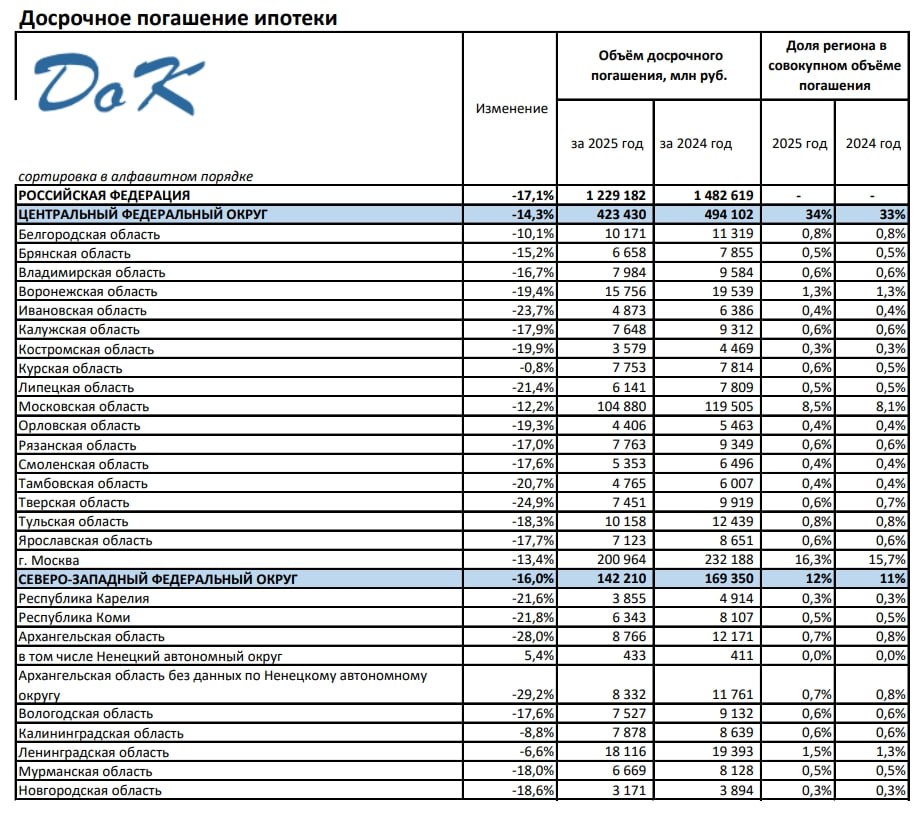 ❗️ Объем досрочного погашения ипотеки по итогам 2025 года сократился на 17%, или на 253 млрд рублей, по сравнению с 2024 годом.