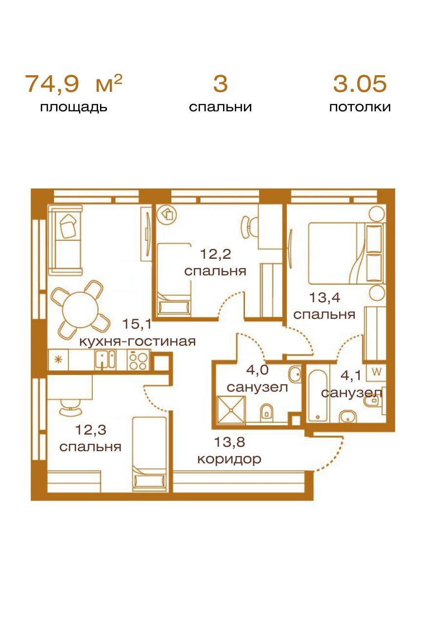 Её ключевое преимущество — рациональная планировка: мастер-спальня с собственной ванной, две отдельные комнаты и удобная кухня-гостиная. Всё продумано для семейного сценария жизни — без пустых метров и случайных решений.
