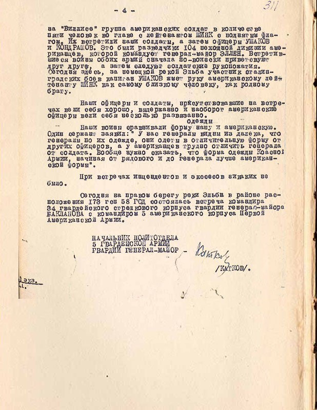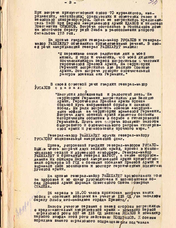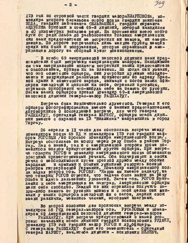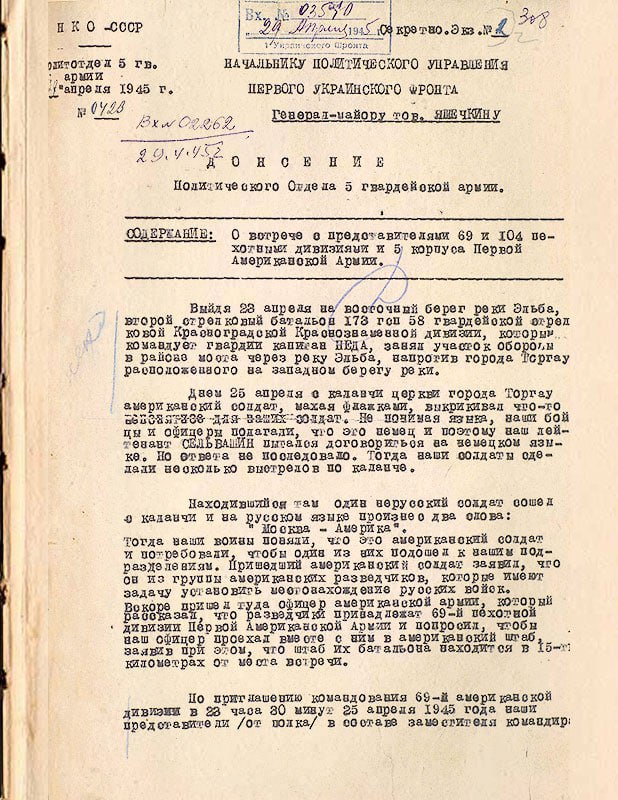 ✅ Но самая первая встреча солдат СССР и США произошла чуть раньше - в тот же день в 13:30 в 5 км от Ризы. Встреча произошла между бойцами 6-ой стрелковой роты старшего лейтенанта Г.С. Голобородько и разведчиками 69-й пехотной дивизии американской армии лейтенанта Альберта Котцебы.