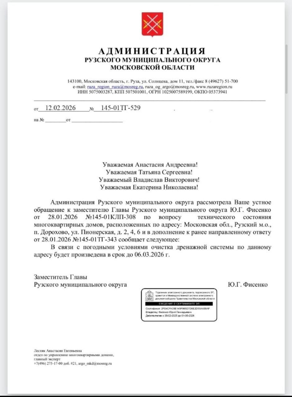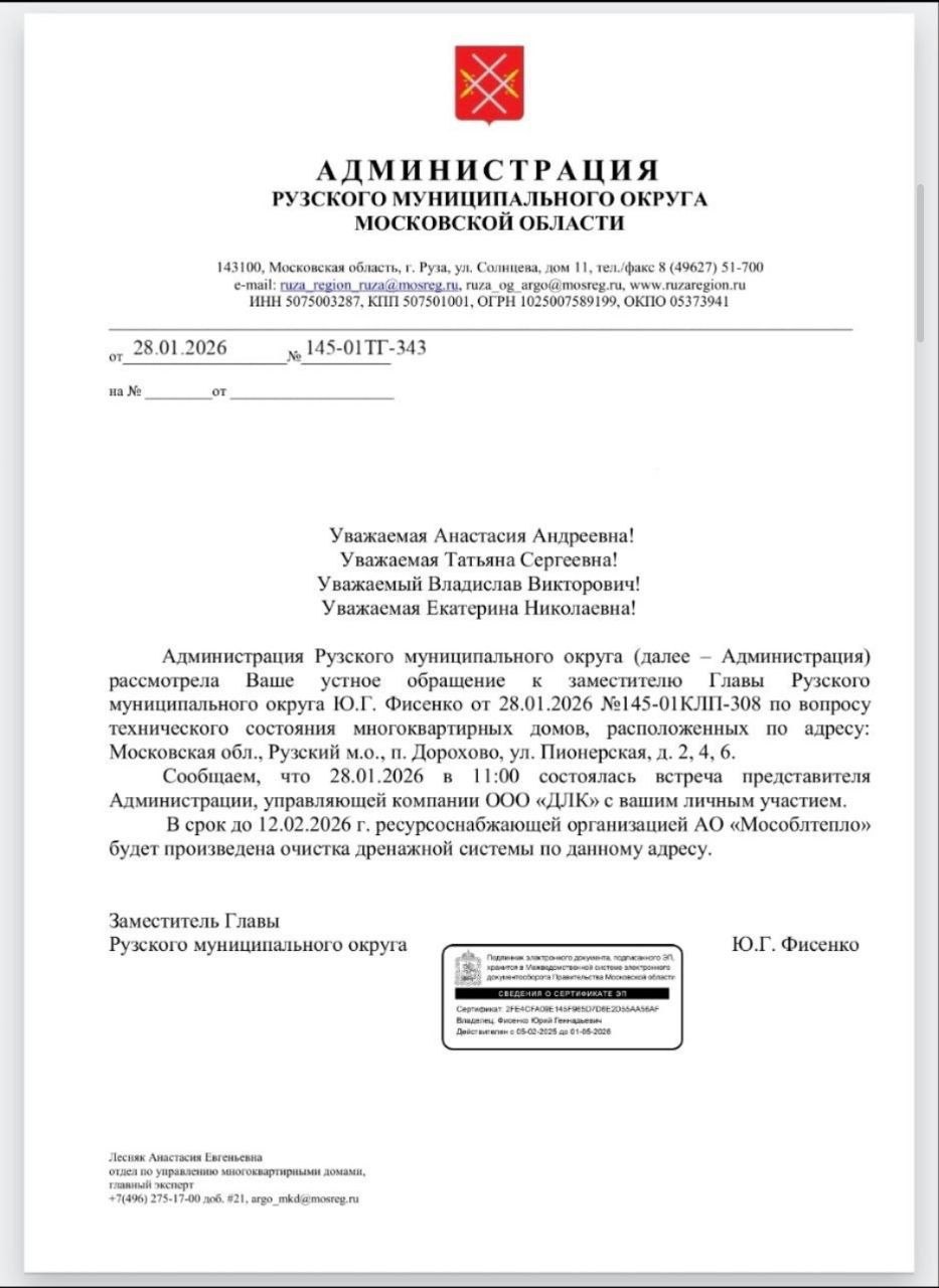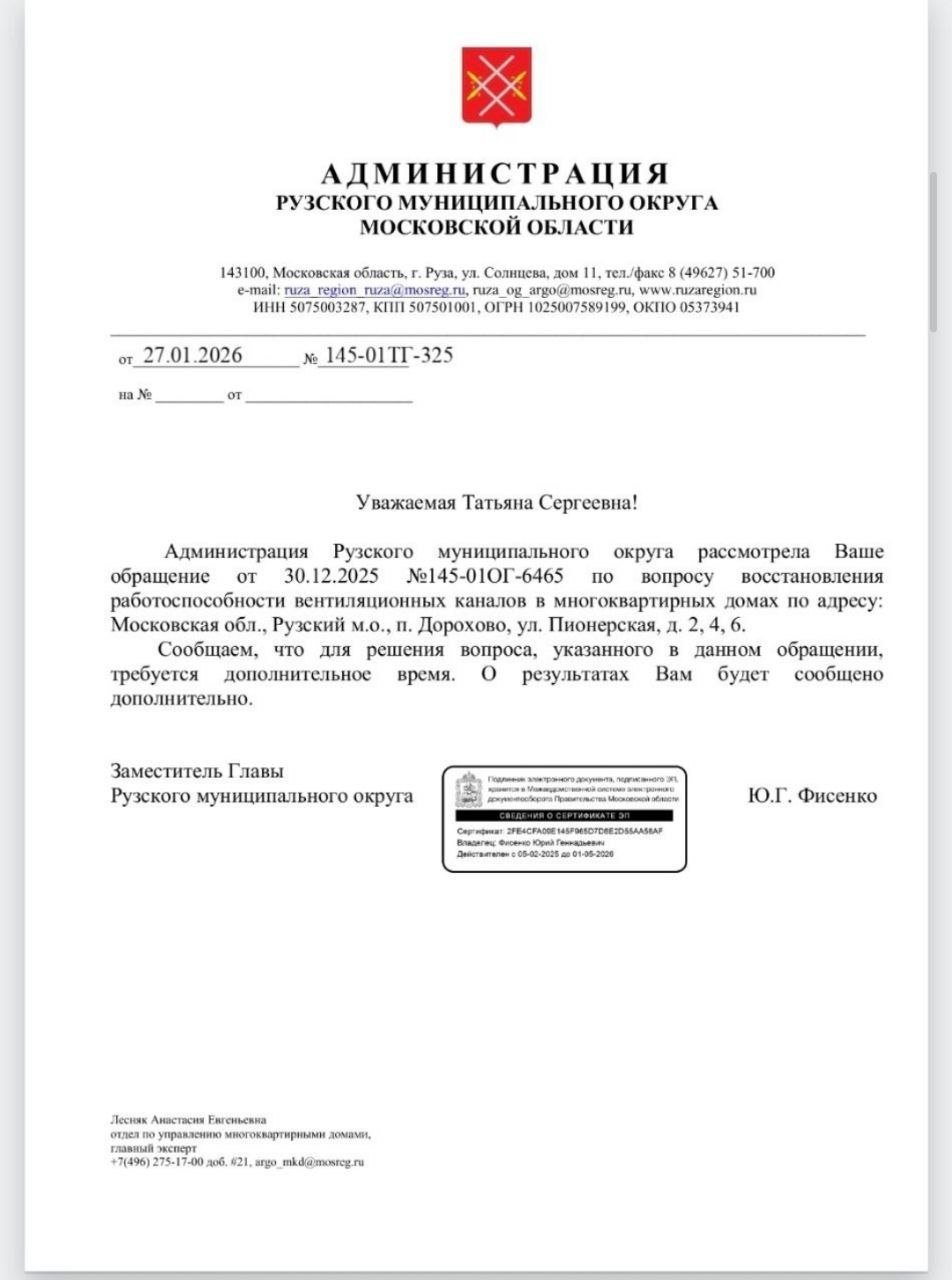15 января 2026 года мы провели общее собрание где просили администрацию рузского округа назначить и провести комплексную экспертизу наших домов так как наши дома имеют износ более 50%, выведена из строя система газоснабжения, наши подвалы затоплены сточными водами, в домах ужасный запах тухлой воды, дренажная система засорена, питьевые колодцы засорены, в квартирах мкд находиться невозможно.