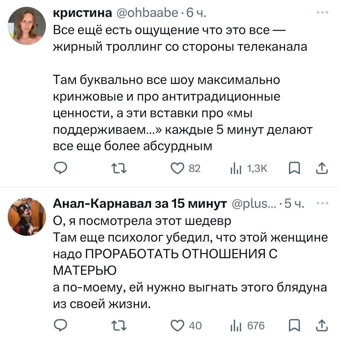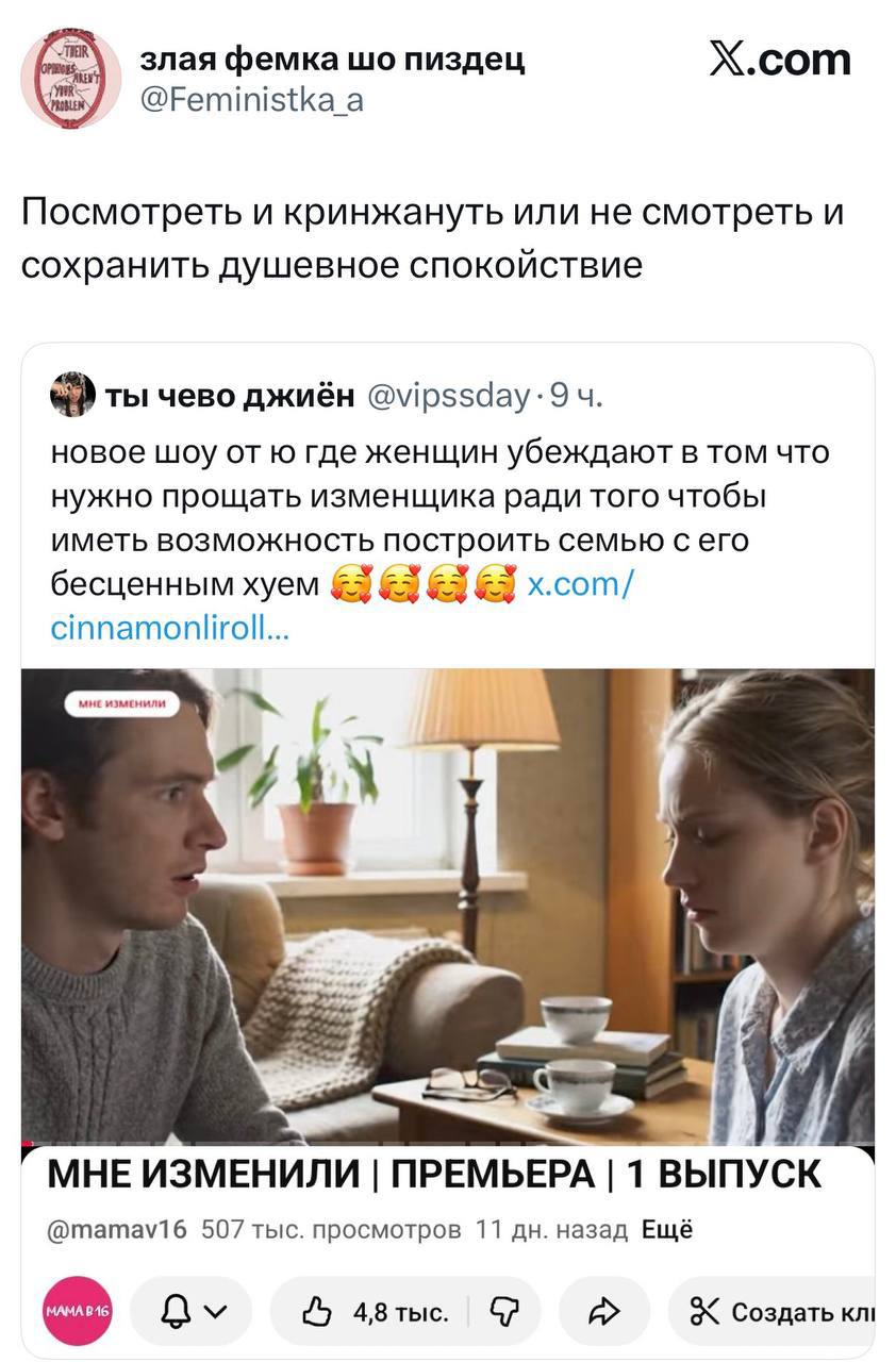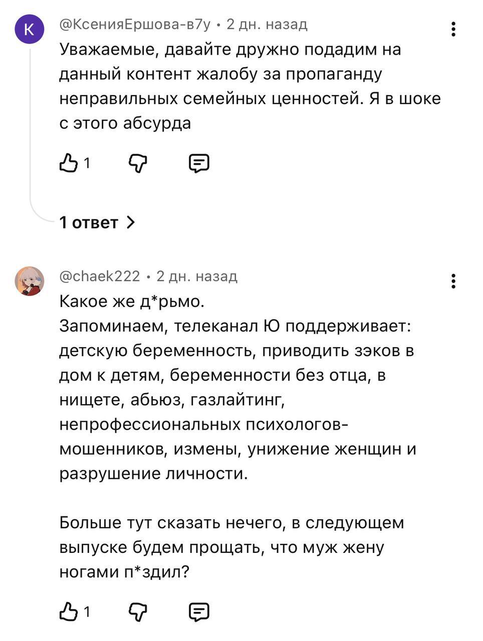 Россиянки в пух и прах разнесли канал Ю из-за шоу «Мне изменили». По сюжету девушке изменяет парень, но они решают не торопиться с расставанием. По факту же психолог на протяжении почти всей серии убеждает девушку, что парни в изменах не виноваты — и отношения нужно прорабатывать с… мамой.