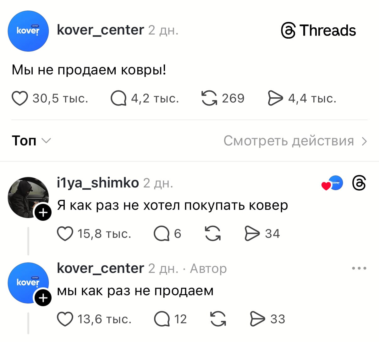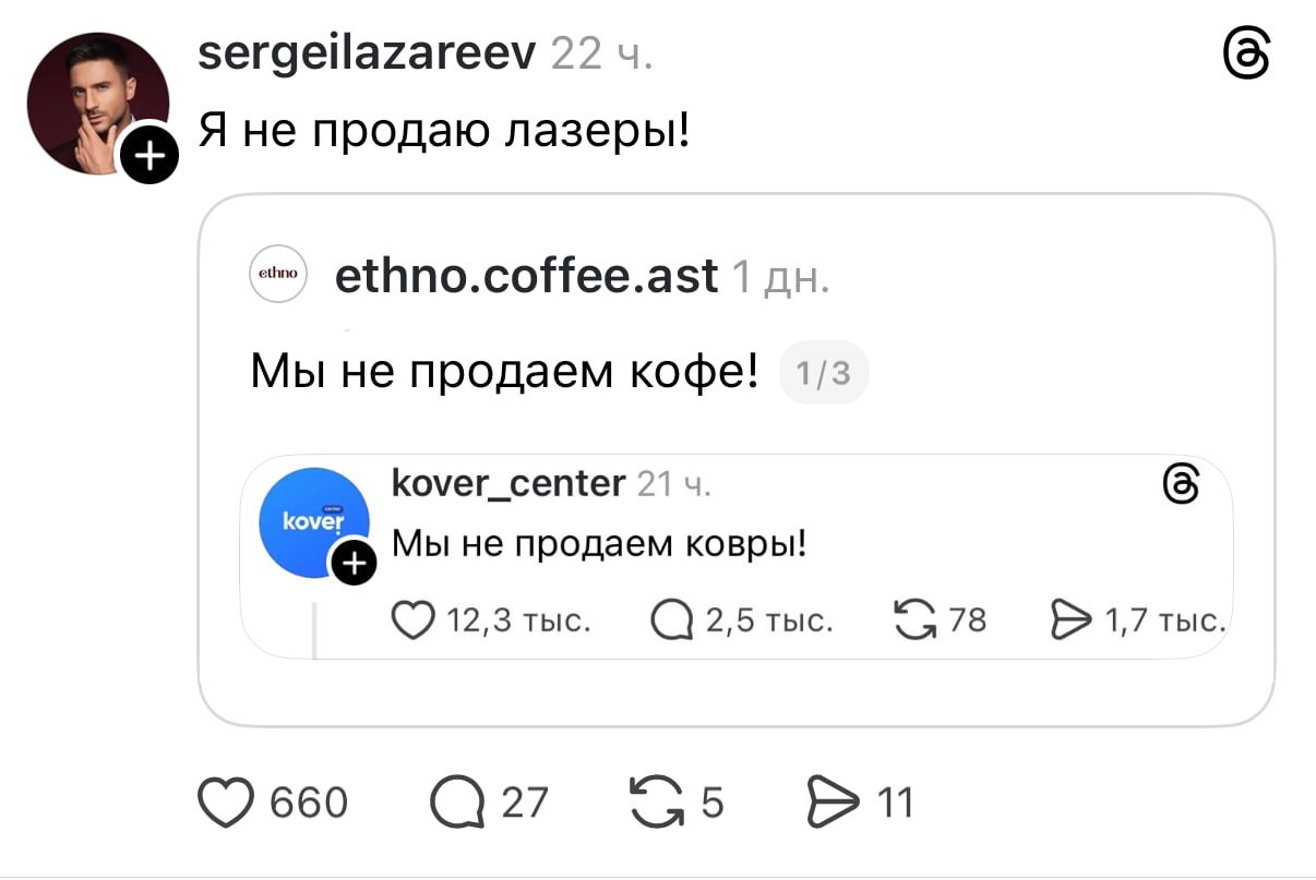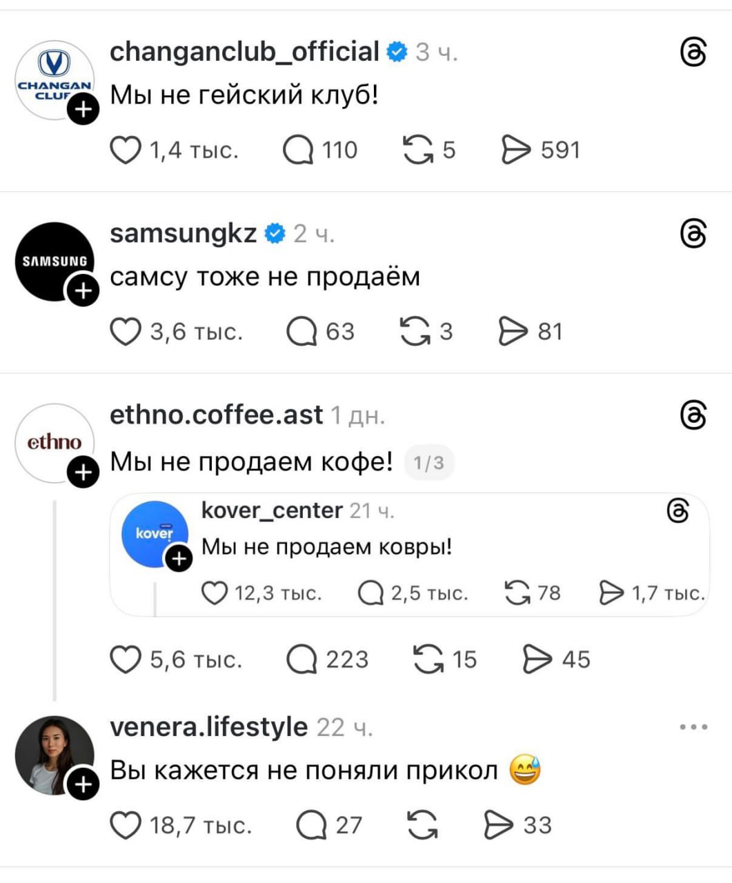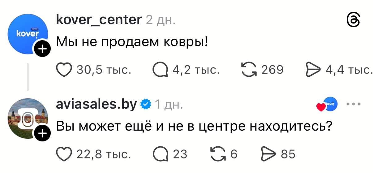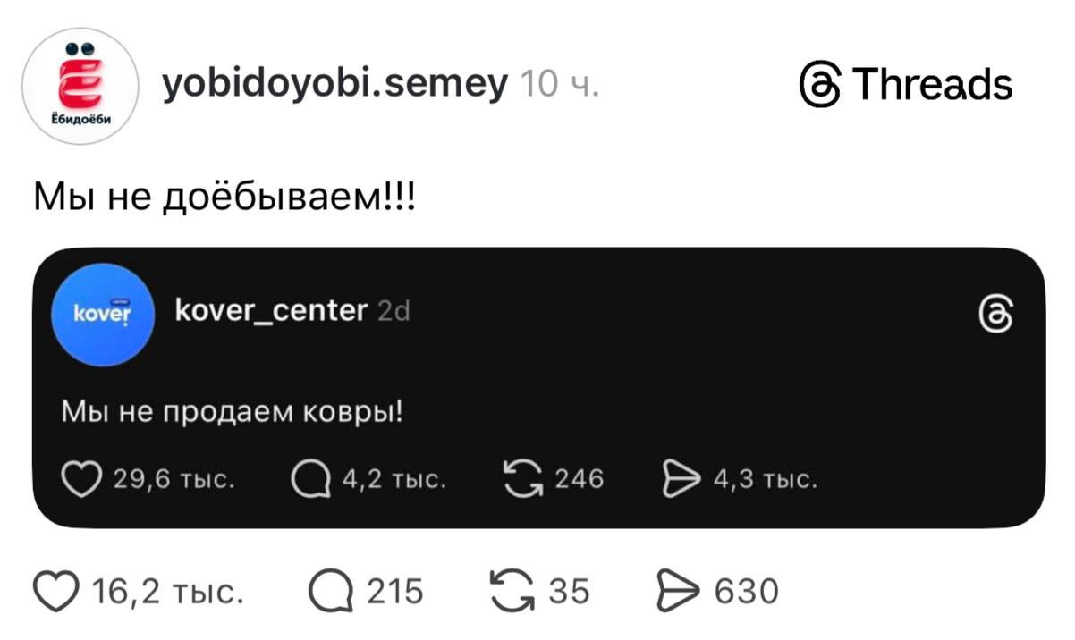 «Мы не продаём ковры». Бренды запустили смешной флешмоб в Тредс — они шутят про названия, которые никак не отражают их вид деятельности.