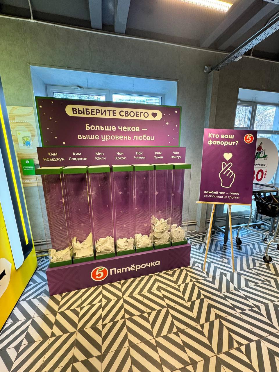 BTS выпускают свой первый альбом за 6 лет — он выйдет 20 марта. По такому случаю Пятёрочка поставила в магазинах стойки для голосования за любимчика из группы. Кидаете чек в контейнер, а потом их отправляют на переработку.