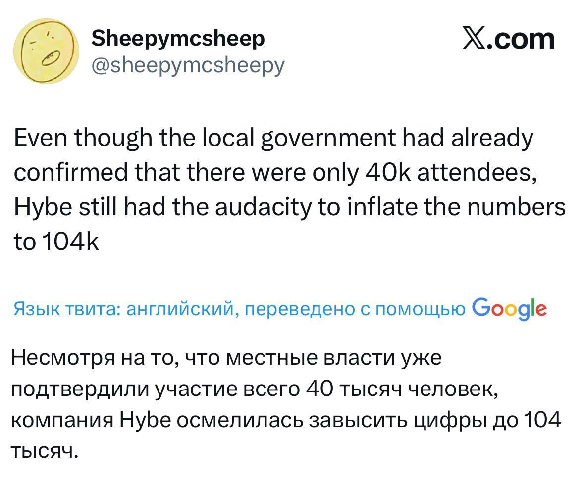 Теперь хейтеры BTS в соцсетях откровенно злорадствуют, в том числе над журналом Rolling Stone, который заявил, что на концерт пришли 250 тысяч человек и что это рекорд в истории Кореи. После этого корпорация HYBE (ей принадлежит лейбл BTS) назвала цифру скромнее и заявила о 100 тысячах человек. Что, впрочем, всё равно сильно меньше ожиданий в 250 тысяч.
