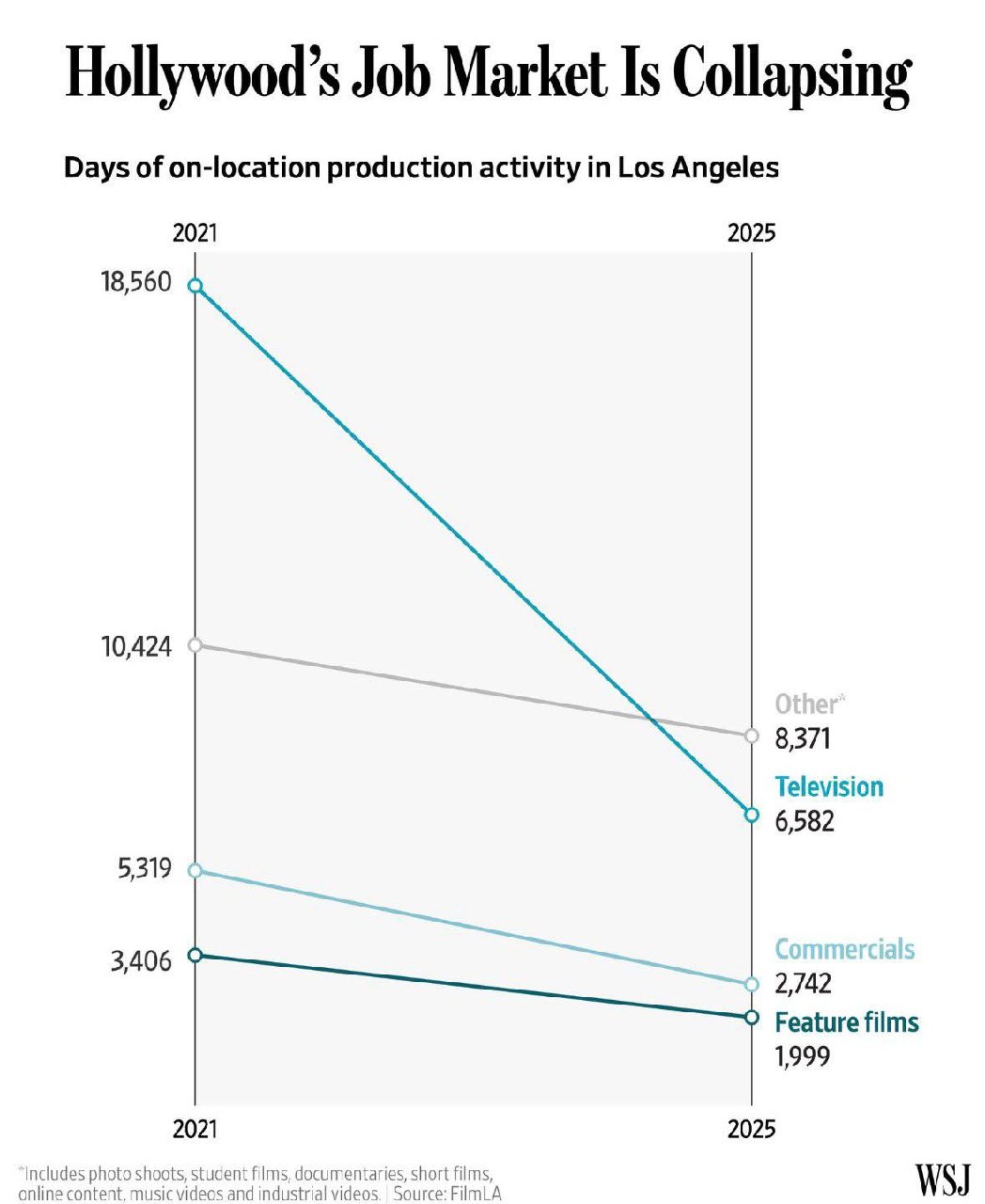 Голливуд умирает. WSJ написал статью об упадке производственной мощи главной кинофабрики мира. В Лос-Анджелесе стали снимать меньше сериалов, меньше фильмов и меньше рекламы. Газета привела график с количеством рабочих дней на проектах, которое за последние 5 лет существенно сократилось.