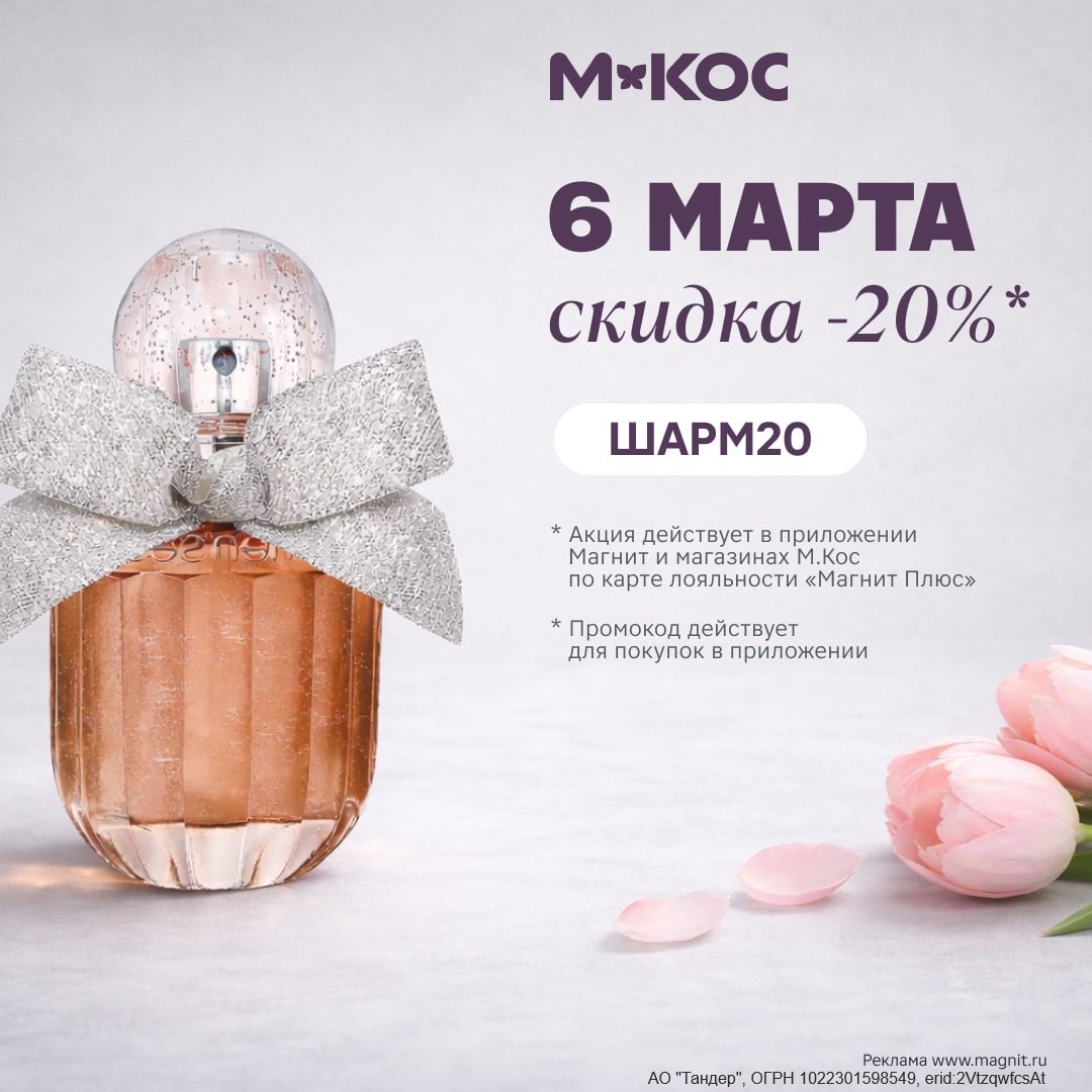 *Предложение действительно 06.03.2026 в магазинах М.Кос и мобильном приложении «Магнит: акции и доставка» (6+) с картой лояльности Магнит Плюс. Скидка действует на весь ассортимент. Количество товара ограничено. Подробности у продавцов и в мобильном приложении. АО «Тандер», ОГРН 1022301598549, г. Краснодар, ул. им. Леваневского, 185.