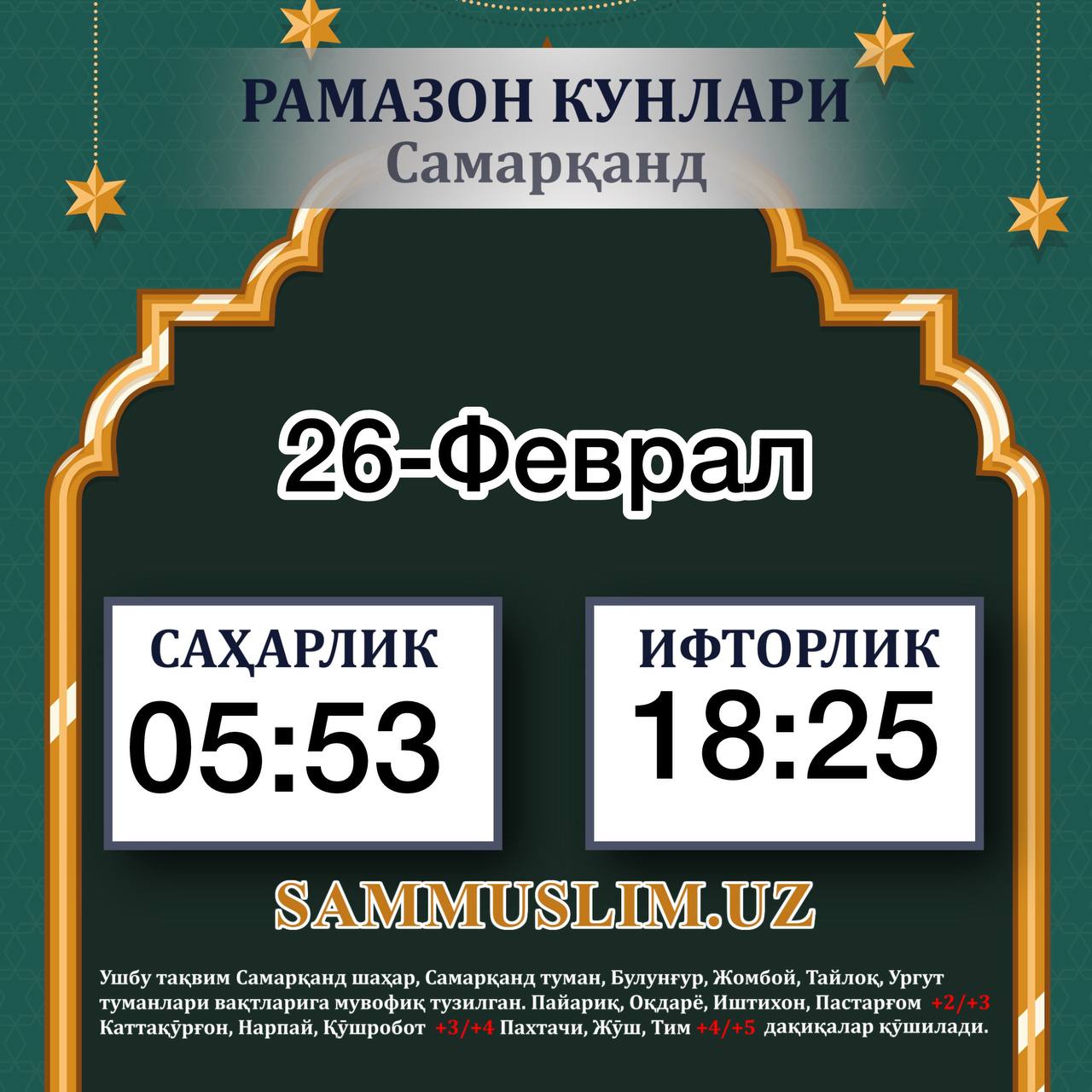 🌙 Самарқанд Вилояти учун 2026-йил кунлик Рамазон тақвими