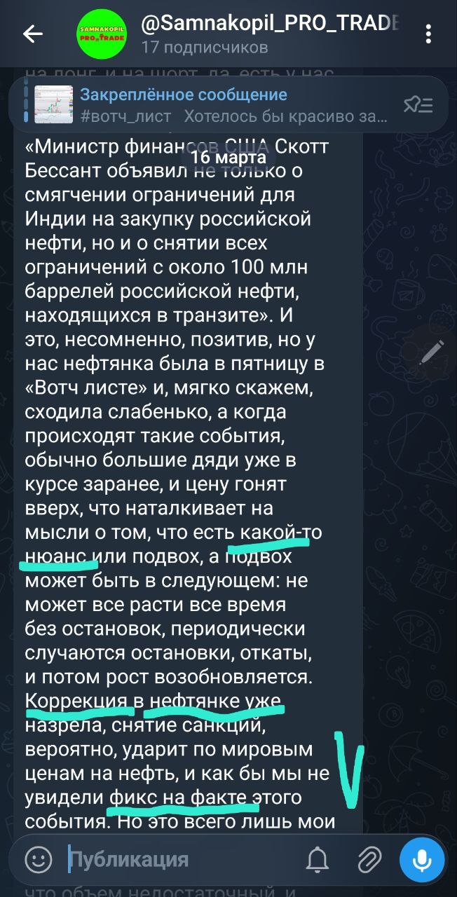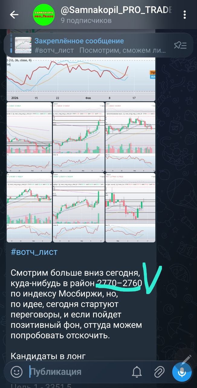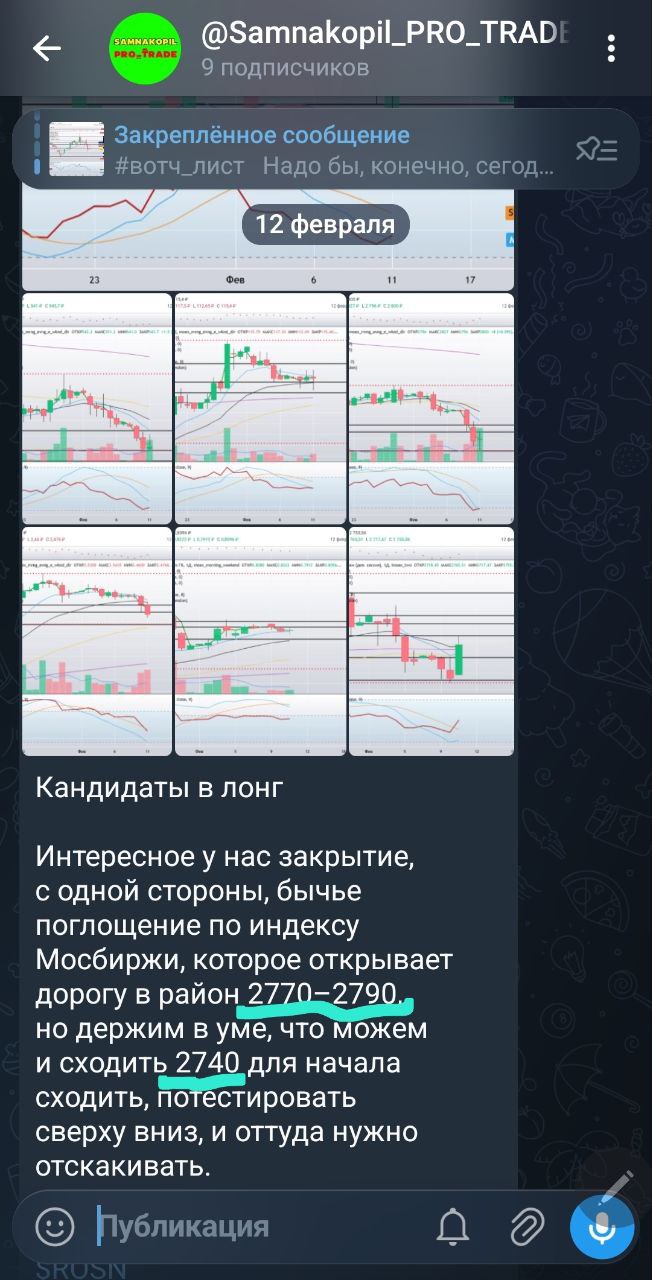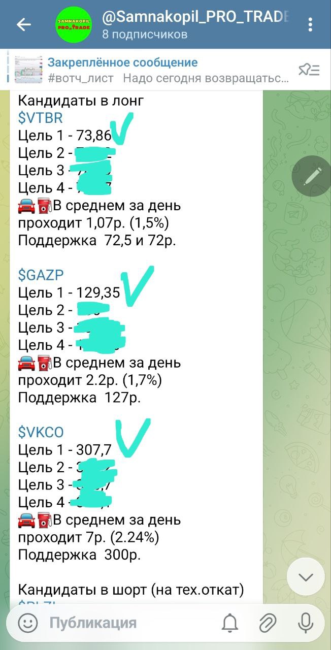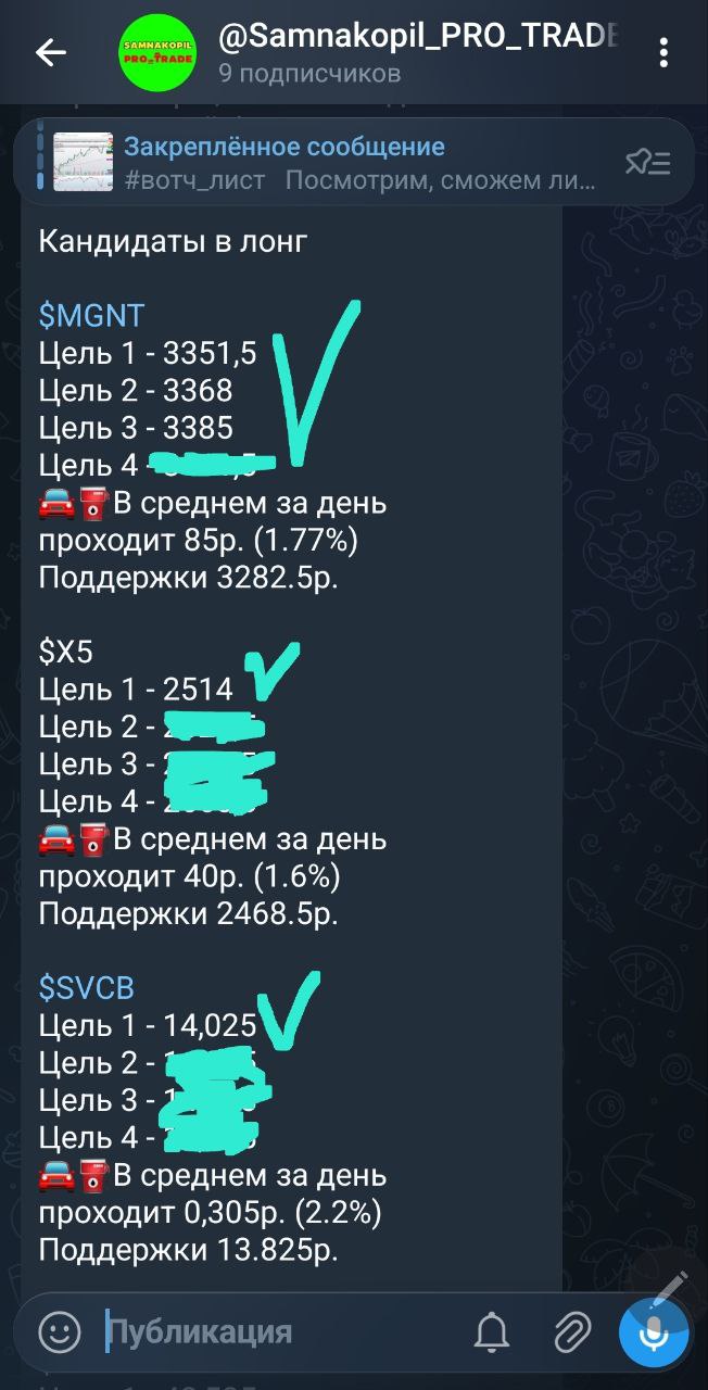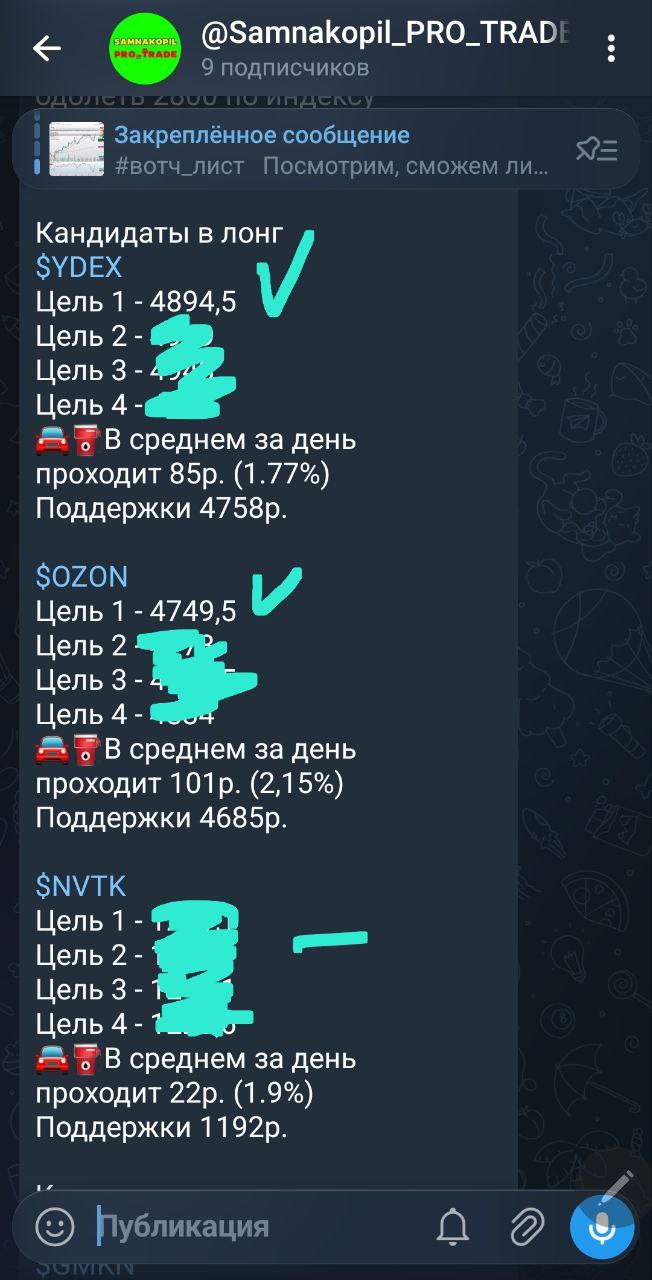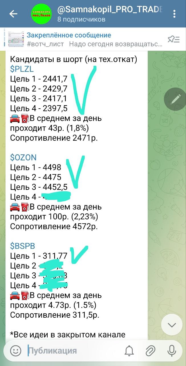 В закрытом канале каждый день до открытия торгов я делюсь своими вотч-листами с идеями как в лонг, так и в шорт, после закрытия торгов — анализ и разбор всех идей, даже тех, которые не отработали сегодня, с наилучшими точками входа и выхода, а также делюсь своим видением и мыслями по рынку.