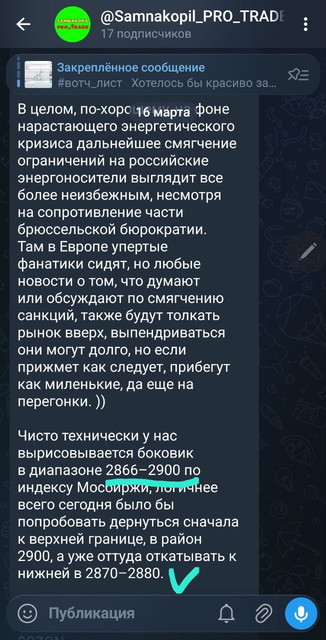 *Все идеи в закрытом канале являются результатом технического анализа, анализа основаны на ценовых уровнях, на среднем движении инструмента за день, с использованием индикаторов RSI и MACD, 100% результат которых не может быть гарантирован в виду особенностей рынка.