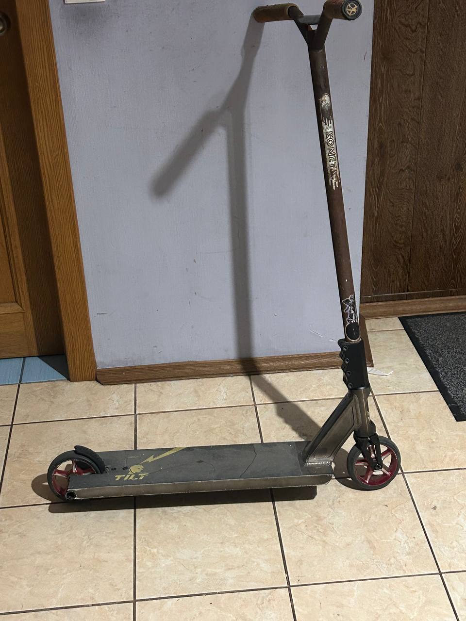 За эти годы он сильно изменился: внешний вид уже совсем другой — без волос, с татуировками. Но есть вещи, которые остались с ним до сих пор. Например, тот самый руль с «Кометой», который ему отправляли из Минска ещё в 2021. Он так и стоит на самокате — как память о тех временах.