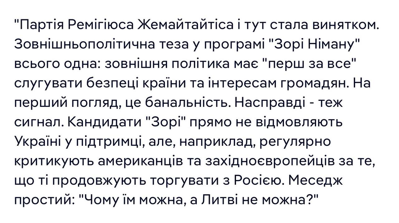 Прочитав, що в Литві, скоріш за все, відверта проросійська (яка виступає за російську мову та РПЦ) партія Литви увійде до складу парламентської коаліції, бо праворадикальна партія з неї вийшла, через те що вона «антиукраїнська, антиєвропейська та антисемітська». Почав гуглити в чому «антиукраїнськість» литовських правих. Виявляється в тому, що вони кажуть, що якщо США та ЄС торгують з ерефією, то і Литва має на це моральне право в рамках національного егоїзму.