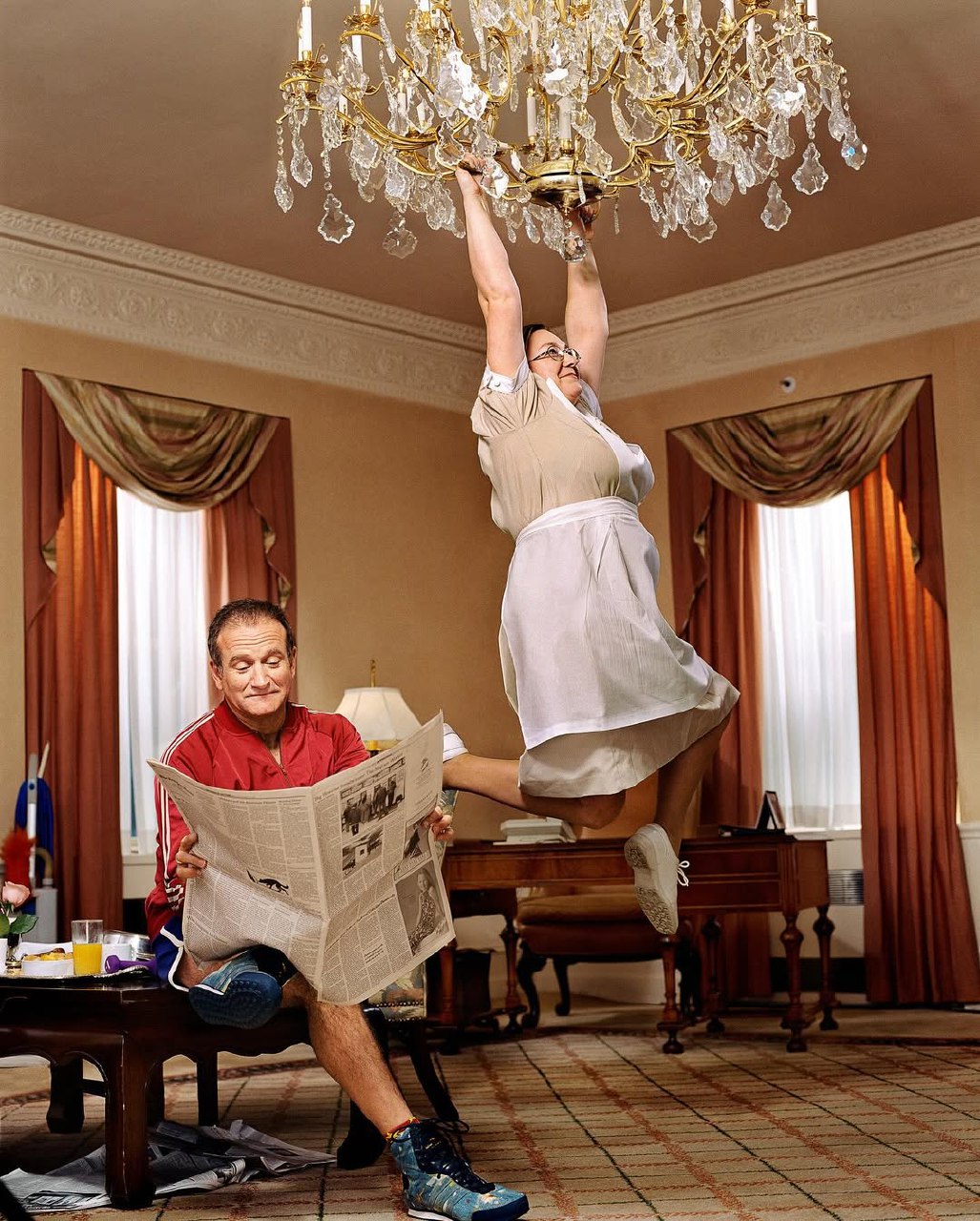 «Пока я впитывал информацию о Робине Уильямсе для этого заказа, меня увлекла его безграничная энергия, его телесность в юморе. Появилась идея снять его, раскачивающимся на люстре, и я арендовал номер в Waldorf Astoria. Там был подходящий старомодный интерьер.
