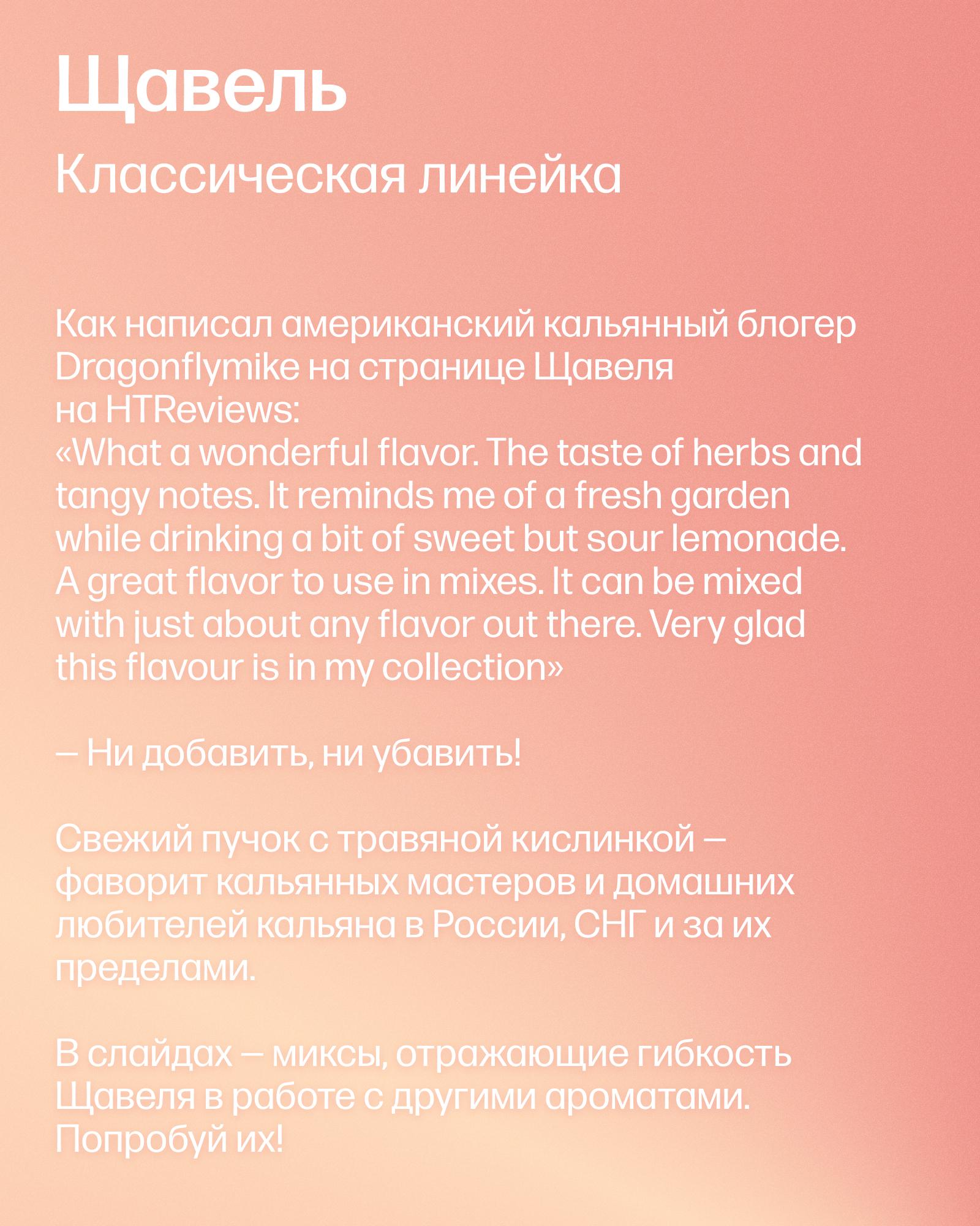 Добавь в планы попробовать миксы с Щавелем — одним из самых популярных ароматов Сармы. Дима, амбассадор из Москвы, собрал несколько вкуснейших сочетаний — попробуй их все!