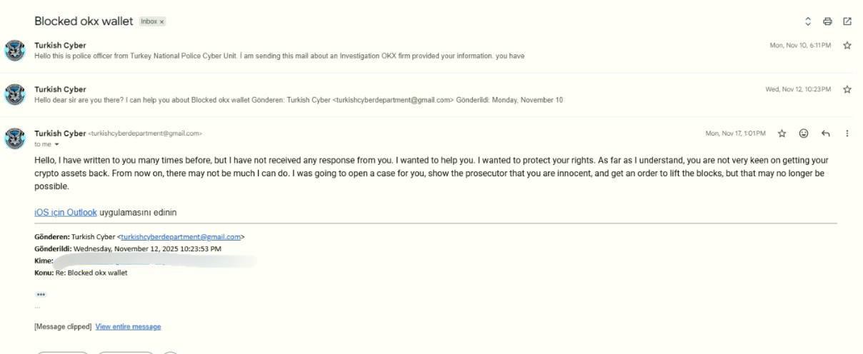 👉 Следом на почту пришло сообщение с фейкового аккаунта Турецкого киберподразделения полиции с содержанием вроде «мы знаем, что вы не виноваты, заплатите нам $10к и мы поможем снять блокировку»