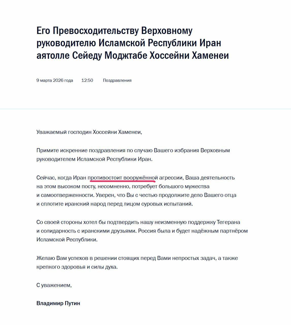 Ну а В. В. Путин нынче поздравил нового верховного лидера (рахбара) Ирана Моджтабу Хаменеи. Указав, что «сейчас, когда Иран противостоит вооружённой агрессии, Ваша деятельность на этому посту несомненно, потребует большого мужества и самоотверженности».