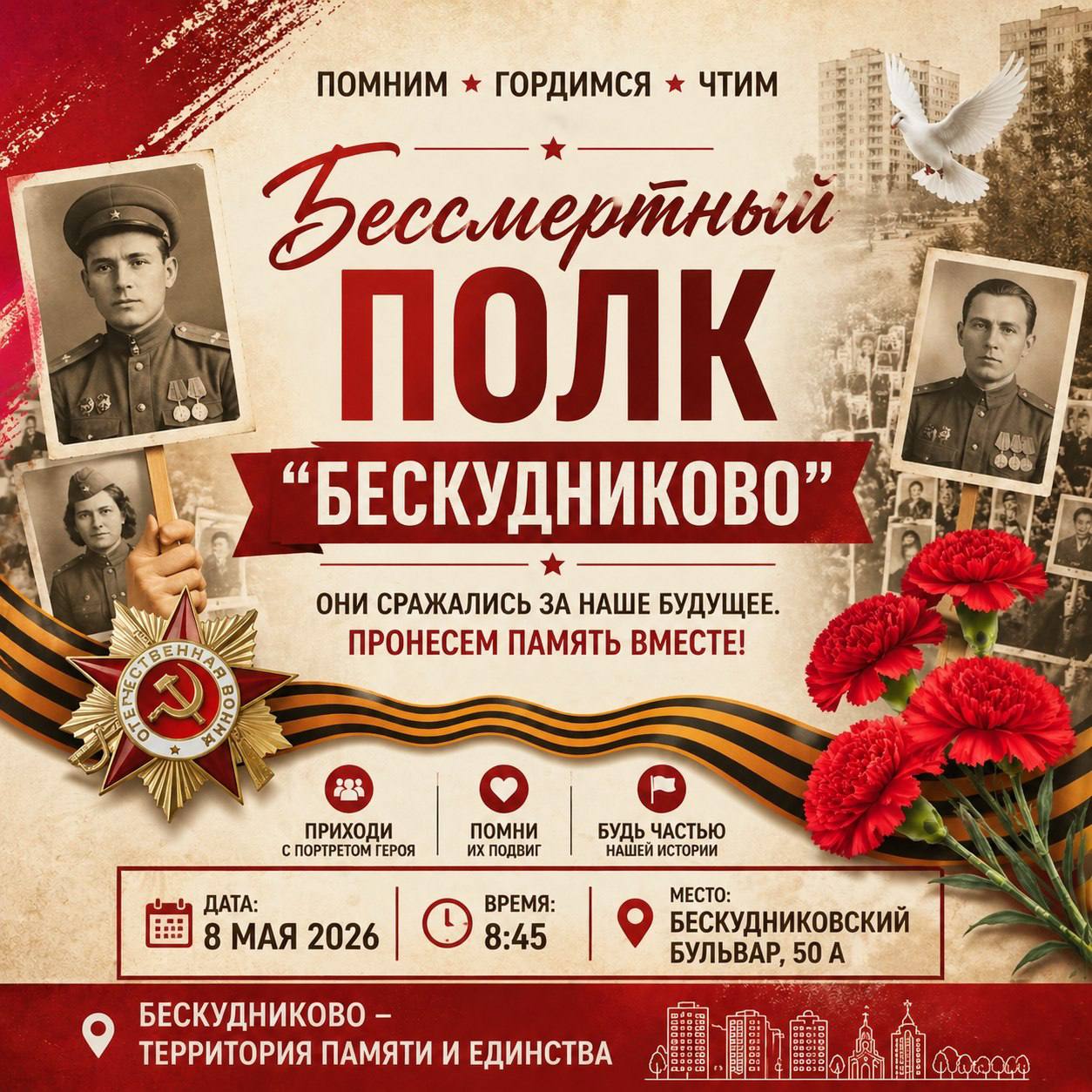 ⭐️В шествии могут принять участие все желающие, пронести портреты своих родственников — участников Великой Отечественной войны (из числа обучающихся, их родителей, педагогов Школы «Бескудниково»).
