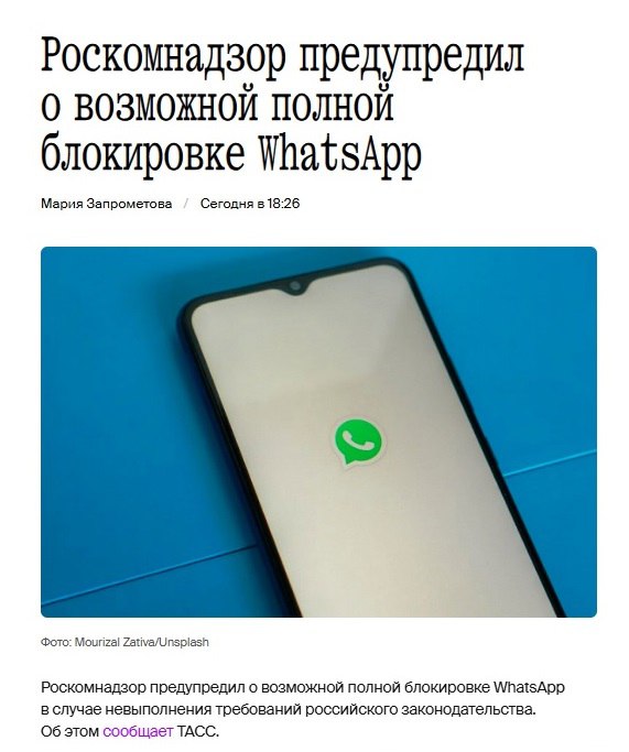 Роскомнадзор заявил о возможной полной блокировке мессенджера WhatsApp (принадлежит корпорации Meta*, признана в РФ экстремистской и запрещена) на территории России. 🤔