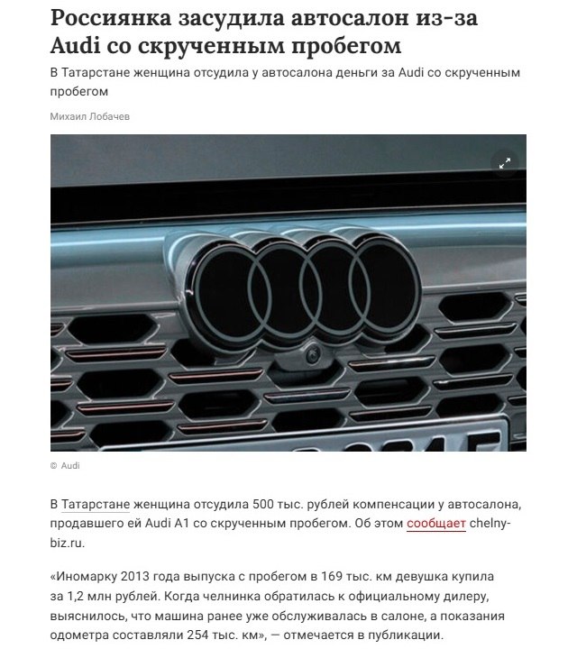 Жительница Набережных Челнов взыскала 573 тыс. рублей с автосалона, продавшего ей иномарку 2013 года со скрученным пробегом, пишут местные СМИ. 👨⚖️