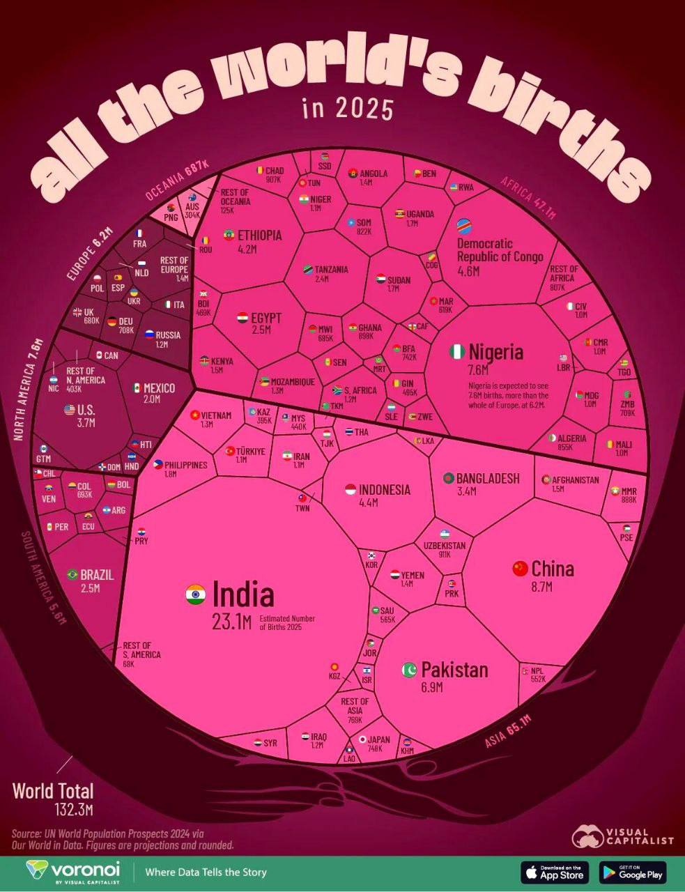 Лидерами остаются Индия и Китай. Во всей Европе за год родилось около 6,3 млн детей. Китай — 8,7 млн, Япония — 750 тысяч, Южная Корея — всего 245 тысяч.