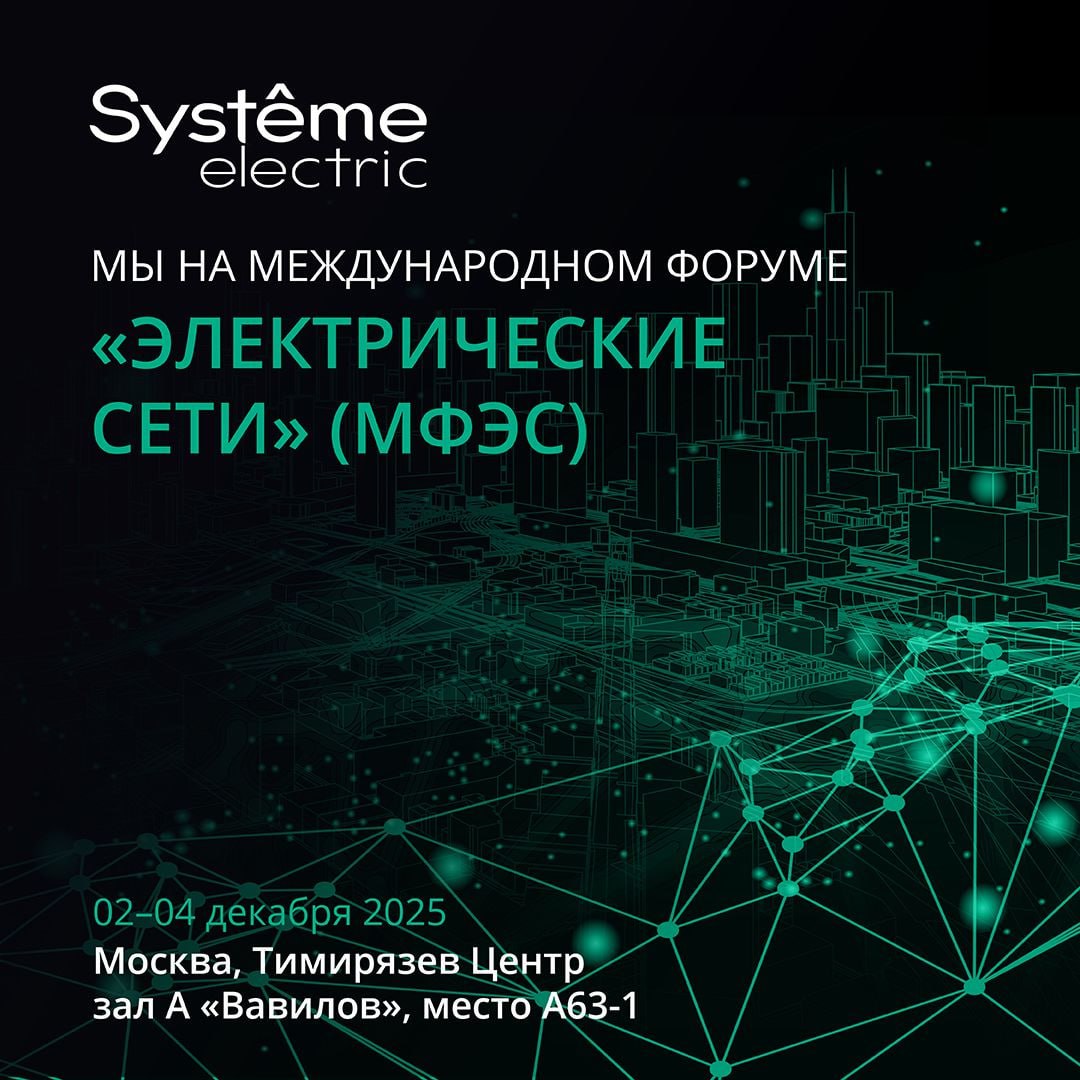 Systeme Electric на МФЭС-2025 С 2 по 4 декабря ждем вас на Международном форуме «Электрические сети» (МФЭС-2025) в московском «Тимирязев центре». В этом году мы, как партнеры форума, представим ключевые разработки собственного производства. Что будет на стенде Systeme Electric: ⏺ Газоизолированные распределительные устройства SystemeRSF и RME (локализация RME — более 90 баллов из 100 по аттестации «Россетей»); ⏺ Автоматические выключатели SystemePact ACB и CCB; ⏺ Блоки релейной защиты БМРЗ и системы от НТЦ «Механотроника»; ⏺ Розетки и выключатели AtlasDesign, ArtGallery, Glossa; ⏺ Комплексные решения SystemeOne, SystemeBlock, SystemeSmart и др.; ⏺ Решения Dekraft — от напольных шкафов до распределительных щитов ЩРНМ NEW . Также покажем ПО WebScadaMT для автоматизации подстанций, включённое в реестр отечественного ПО. 📍 Место: Москва, Верхняя аллея, 6с1, «Тимирязев центр», зал "Вавилов" 🗓 Даты: 2–4 декабря ✅ Вход свободный, регистрация обязательна 👋 До встречи на стенде!