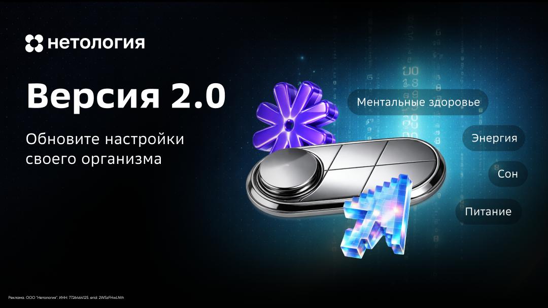 Я нашёл проект «Версия 2.0» от Нетологии и сразу захотел поделиться с вами. Там эксперты с опорой на доказательный подход разбирают 3 направления: питание, энергию и сон, ментальное здоровье. Объясняют, где у вас ключевые зоны перегрузки и как выстроить более устойчивое состояние (не рывками мотивации, а спокойно и последовательно!).